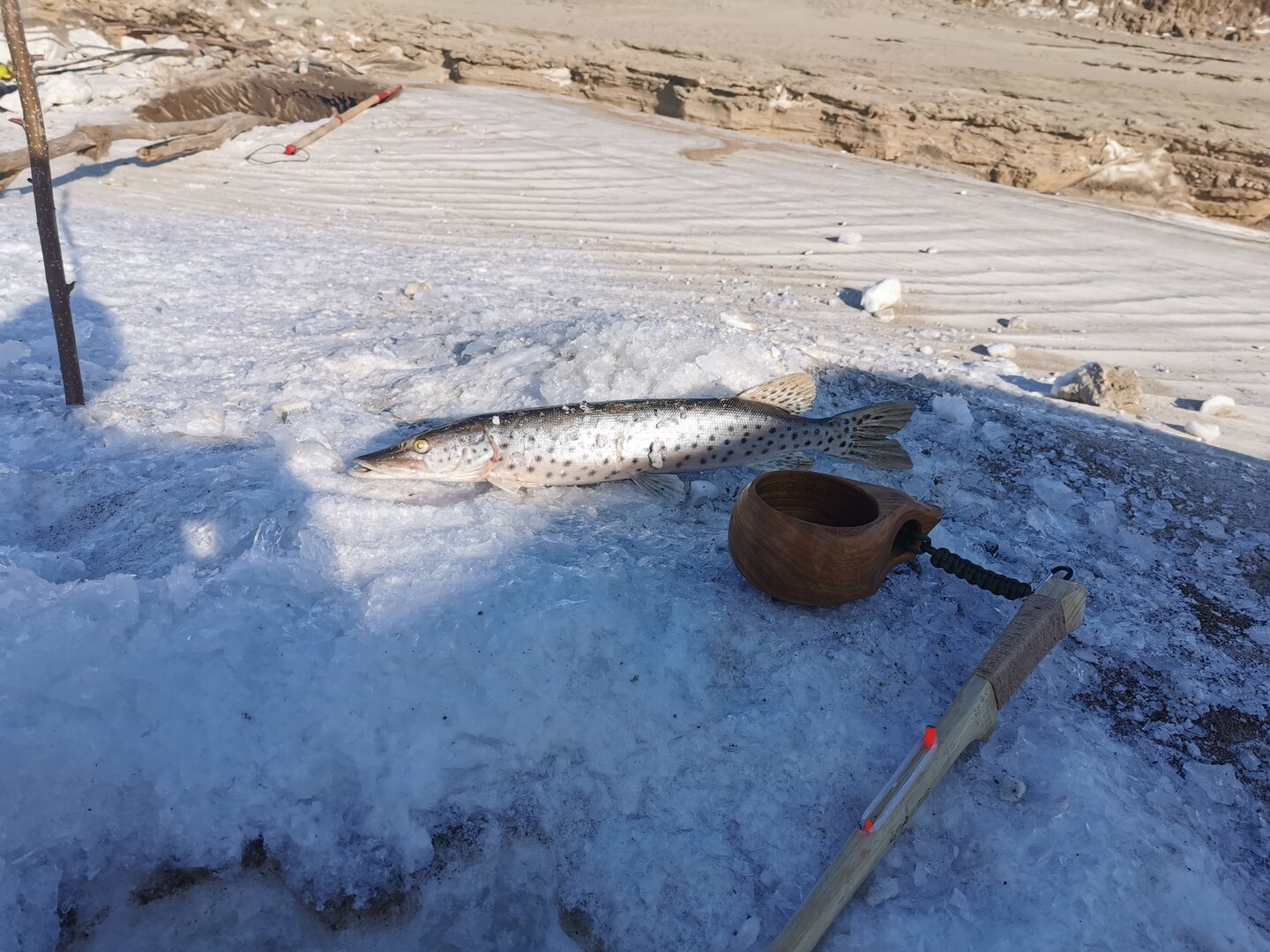 Причем целые майны. Приезжаешь, снасти не достаешь, а разводишь костер на льду, готовишь завтрак (потом обед, ужин) и начинаешь общаться с Подей через пожертвования и возлияния.. Пока лунки не готовы будут. )))