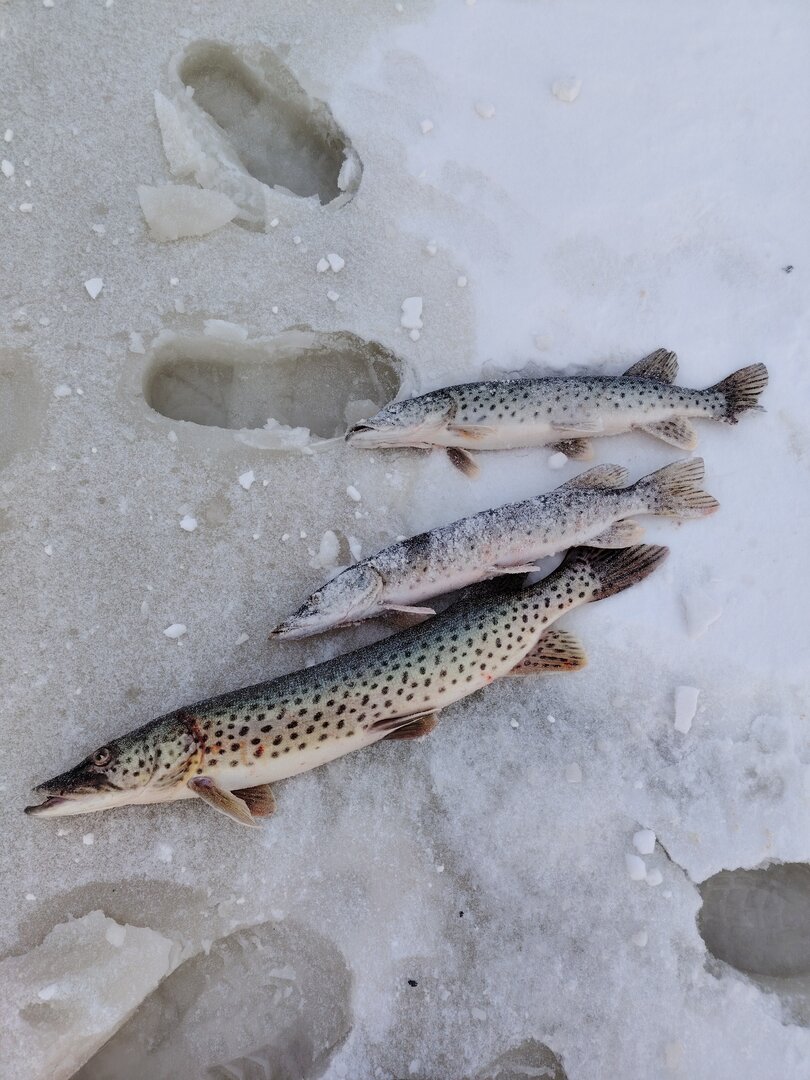 Такая «сонная» погода даже на меня подействовала. Я целый день просидел на одной лунке с одной приманкой в ожидании поклевки. И дождался. Две в зачете, одна ушла. А Тимофей выбрал другую тактику: перемещался между лунками и менял приманки. В итоге, результат лучше: четыре в зачете, две отпустил. Так что не всегда опытного щукаря спасает железная задница. Высиживание порой не срабатывает.