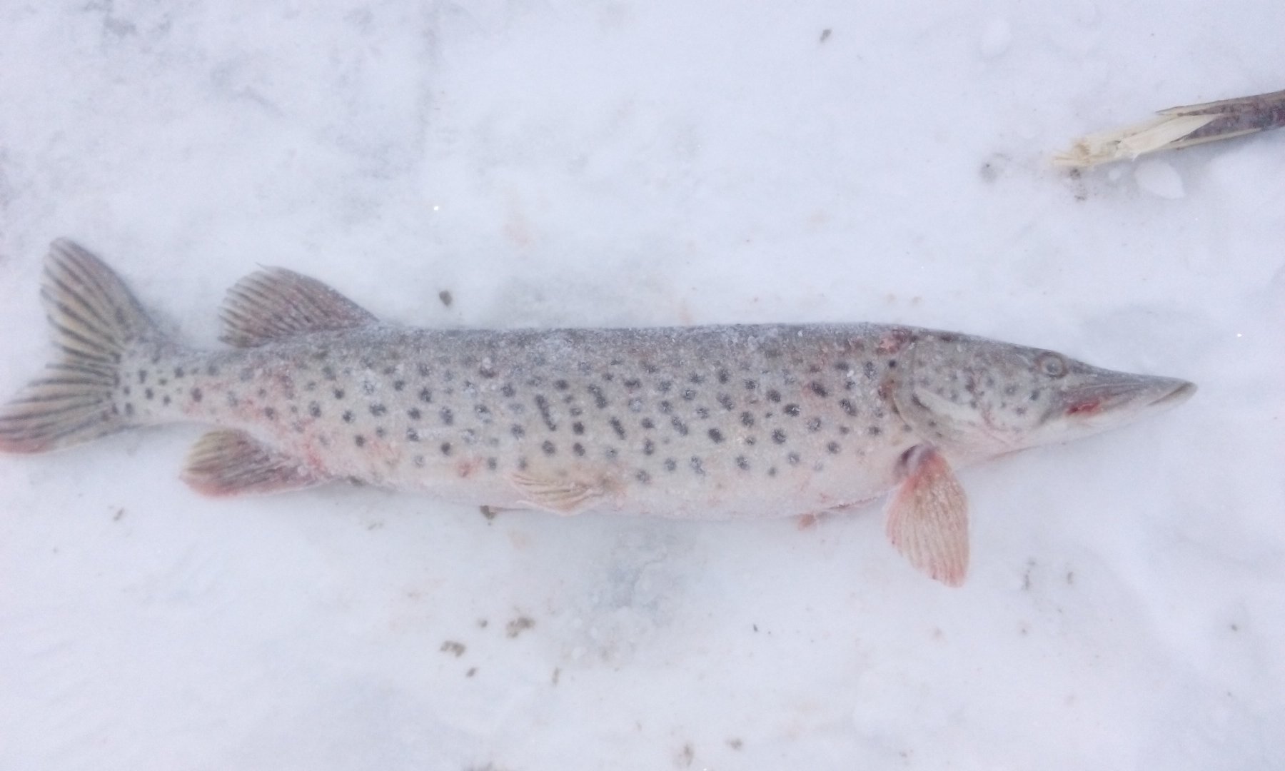 В 8.30 получаю в левую руку ощутимый рывок,подскакиваю и щука практически вылетает из лунки и тут же балансир выскакивает у неё из пасти.Как не повезло щуке и как повезло мне.А зубастая оченно приятного размера,вес на глаз кило 2,контрольное взвешивание дома показало 2.170.