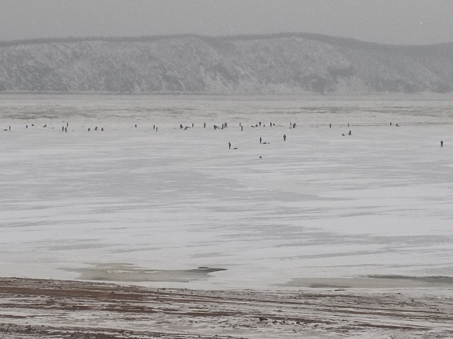 На улице около нуля. Амур ещё не встал. Народу напротив набережной куча. Интересно, ловят чего?![]()