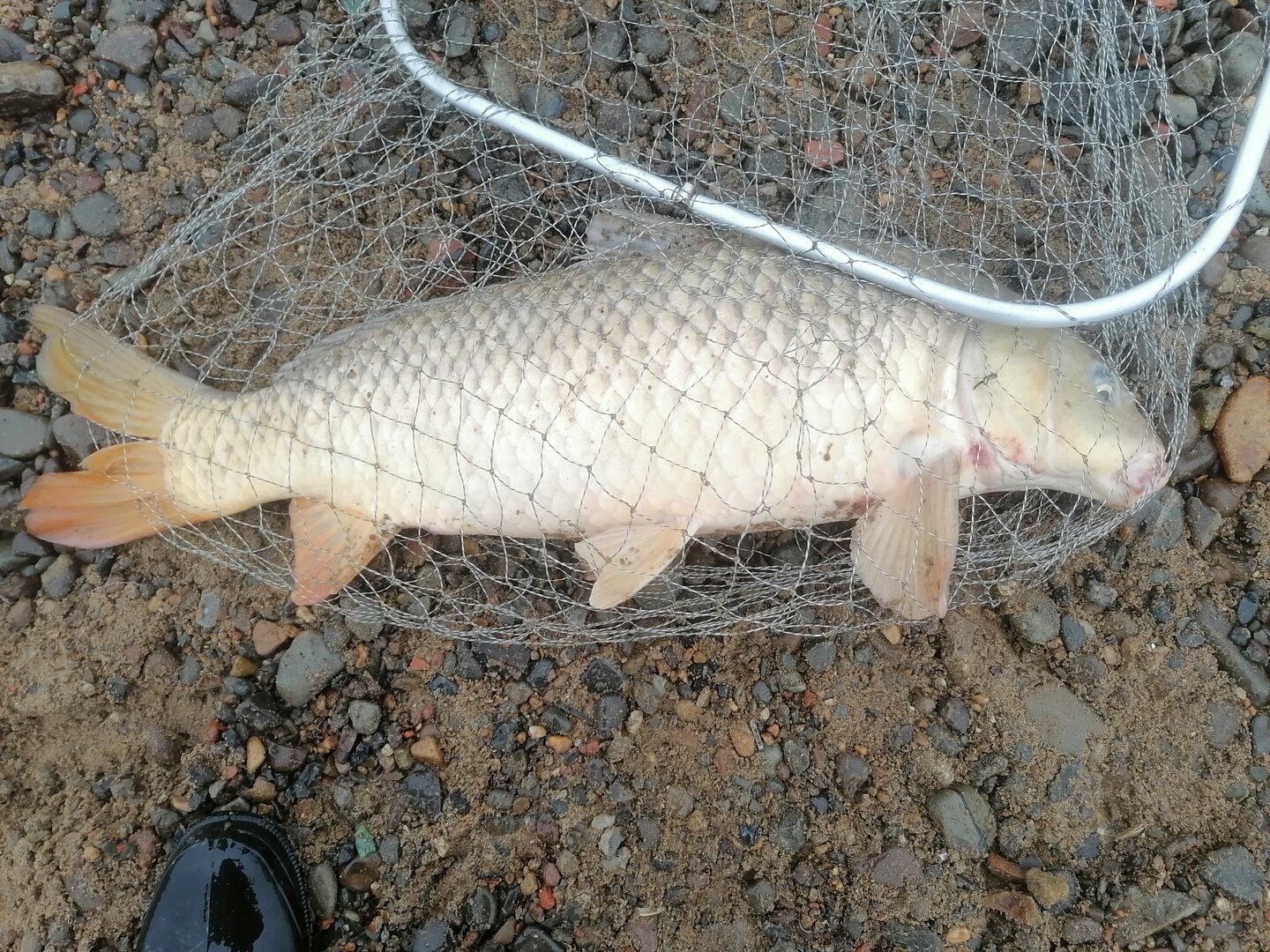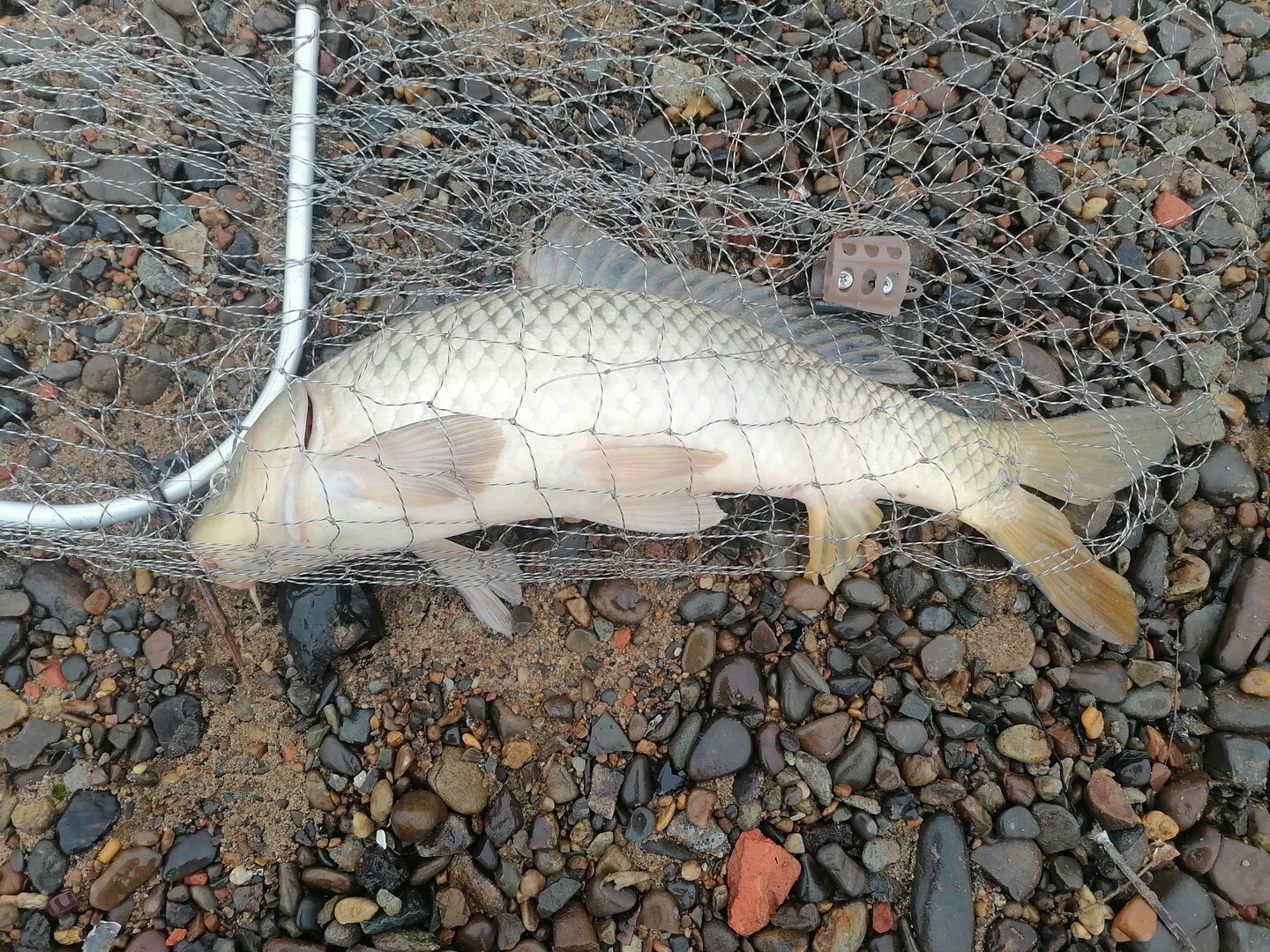 В вначале десятого случиласьтаки ещё поклевка и первый съедобный сазан оказался в подсаке.