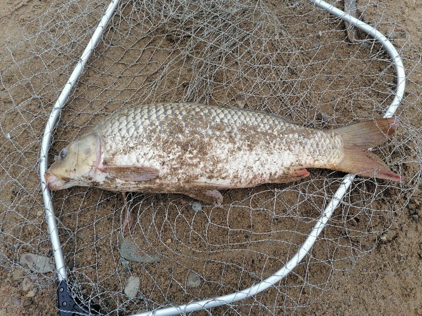 Начинаю выматывать, такое впечатление, что со дна что то тащу, корягу какую то. Но возле берега коряга начинает выступать и удивлением вижу сазанчика. Эмоции долой, беру подсак и принимаю рыбу.