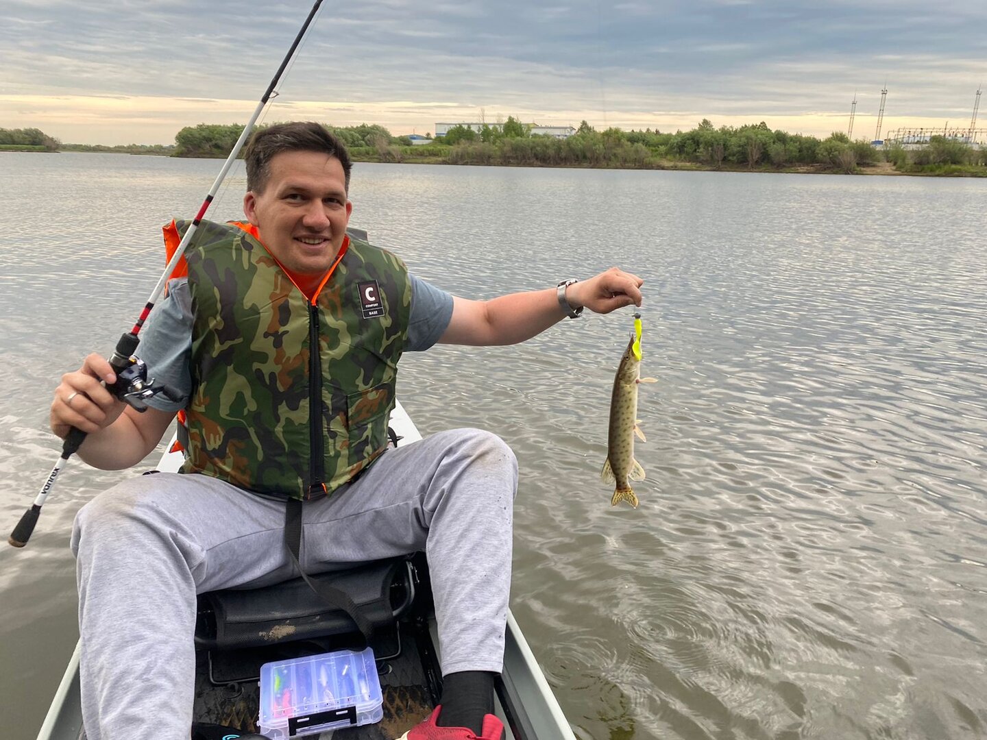 Основная цель поездки была тестирование каяка, но от рыбалки не смогли удержаться и прихватили на борт короткую палку с мультиком и коробочку разных приманок. Добравшись "с ветерком" до не доступных большинству рыболово решили немного порыбачить на первое что под руку попалось)) Первой под руку попалась джиг головка с твистером. С первых же забросов силикон был атакован злобными щукенами размерами в "полкотлеты"))