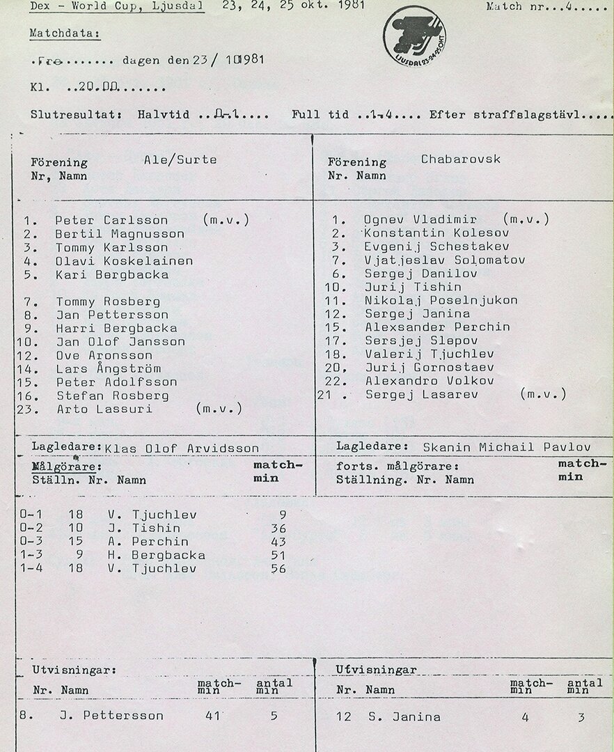 И ещё. За СКА, Першин играл под 8 номером, а за сборную под 15. В протоколе значится 15, похоже ошибка, т.к. привыкли шведы видеть его на уровне сборных именно под этим номером. Чухлов играл под 19 номером, но возможно тогда ещё под 18, тут варианты возможны. Или в международных матчах не было всё так строго и свитера с номерами одевали любые, лишь бы совпадало с заявкой, не могу сказать.