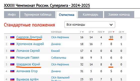 Ну вот и всё, последняя игра ЧР сезона 2024-25 завершена, так что составить конкуренцию нашему Дмитрию Сидорову в конкурсе «Пушечный удар» уже некому. Хоть он сегодня не забил (только результативная передача), но созданный им ранее "задел" позволил финишировать ему в этом конкурсе с большим отрывом от ближайших преследователей. Молодец!С игры не забил, но вот в конкурсе «Пушечный удар» , проводимом газетой «Наша Сибкана» (кто забьет наибольшее количество мячей прямым ударом после розыгрышей угловых), на первое место вышел!