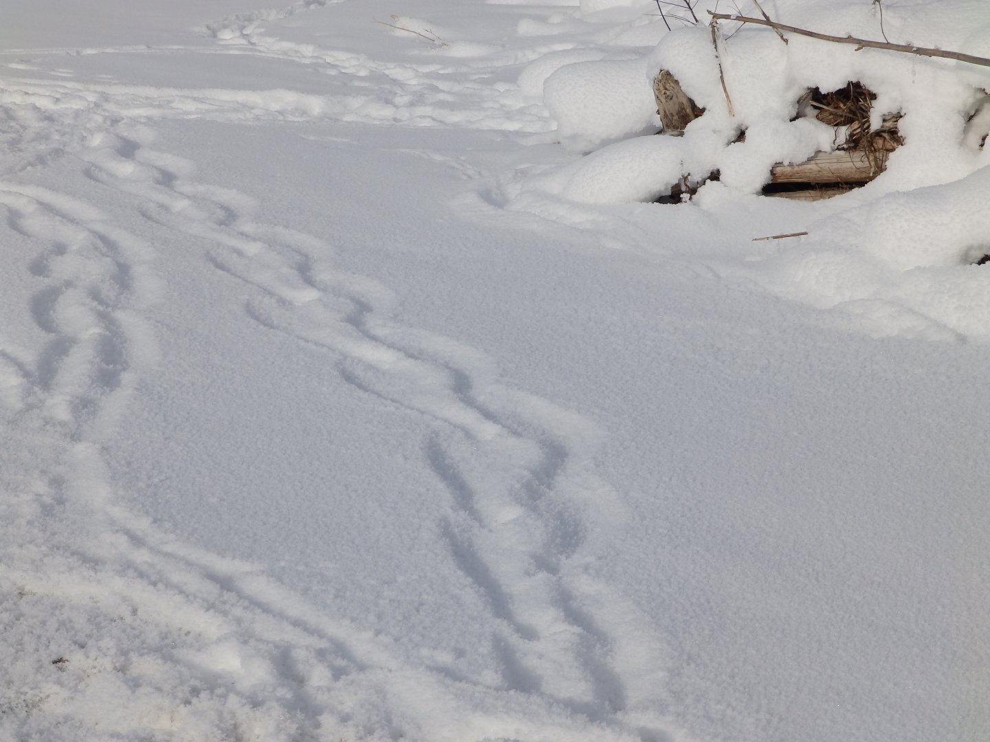 Пошел по этому следу, след ведет к отдушине под береговым ярчиком справа. На втором плане следы человека, который интересовался этой отдушиной. Далее на втором плане - точно норка прыгала, под снегом пещерки характерные пробивала. То что это точно не росомаха - это я видел вживую. Нет характерных медвежонковских следов.