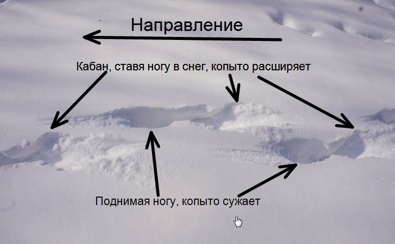 Странная схема, невозможно поставить лапу, ногу, и тд так чтоб снег при этом был не внутрь следа, а наружу! На фото четко виден выброс снега наружу именно с правой стороны, отсюда вывод, что зверь идет слева на право. Про кабана шибко удивился, я почему то думал, что кабан при 40 см должен касаться снега грудью.