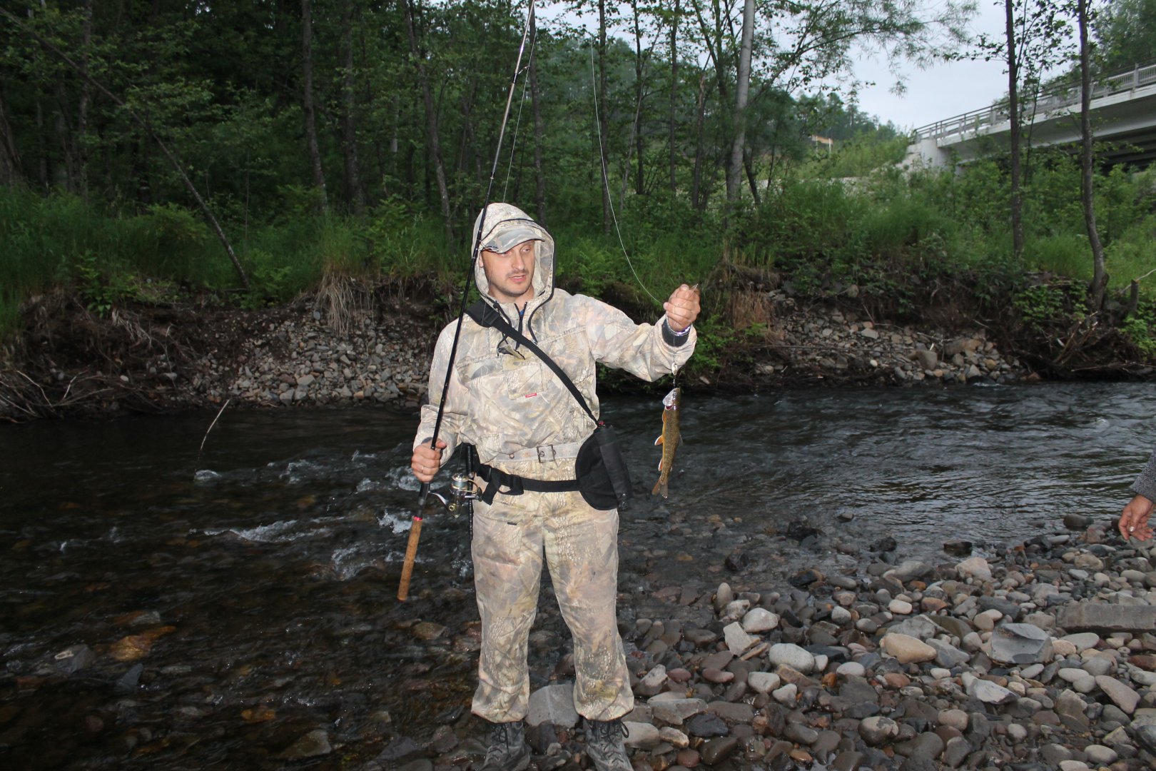 На выходных были на Сихотэ-Алине на Большой Икче, разловил ниакис 9 граммов: хариусы, мальма. Фоток крайне мало из-за непогоды: дождь, сырость, туман, приехали вечером, тут же с первых забросов вытащил мальму и хариуса из ямки ниже переката. Всю ночь поливало, поэтому на следующий день фотик даже не доставали. Был бы мой фотик - таскал бы с собой по речке.