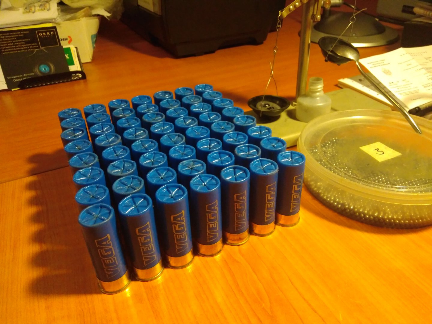Тяжёлая часть рецепта виднеется на левой чаше весов и на баночке с дробью. Подробнее: 35(3)х1.8 Ирбис Охота 1/16К (ну люблю я "злые" патроны:D). Почти в начале приготовления к блюду добавлен обтюратор. Пассировано двумя пробковыми пыжами и под конец готовки - добавлен контейнер, фаршированный той самой Бийской "троечкой". Высота "пирога" отрегулирована вставкой прокладки между пыжами, которая была вырублена из пробковой подложки для паркета (2.5мм).