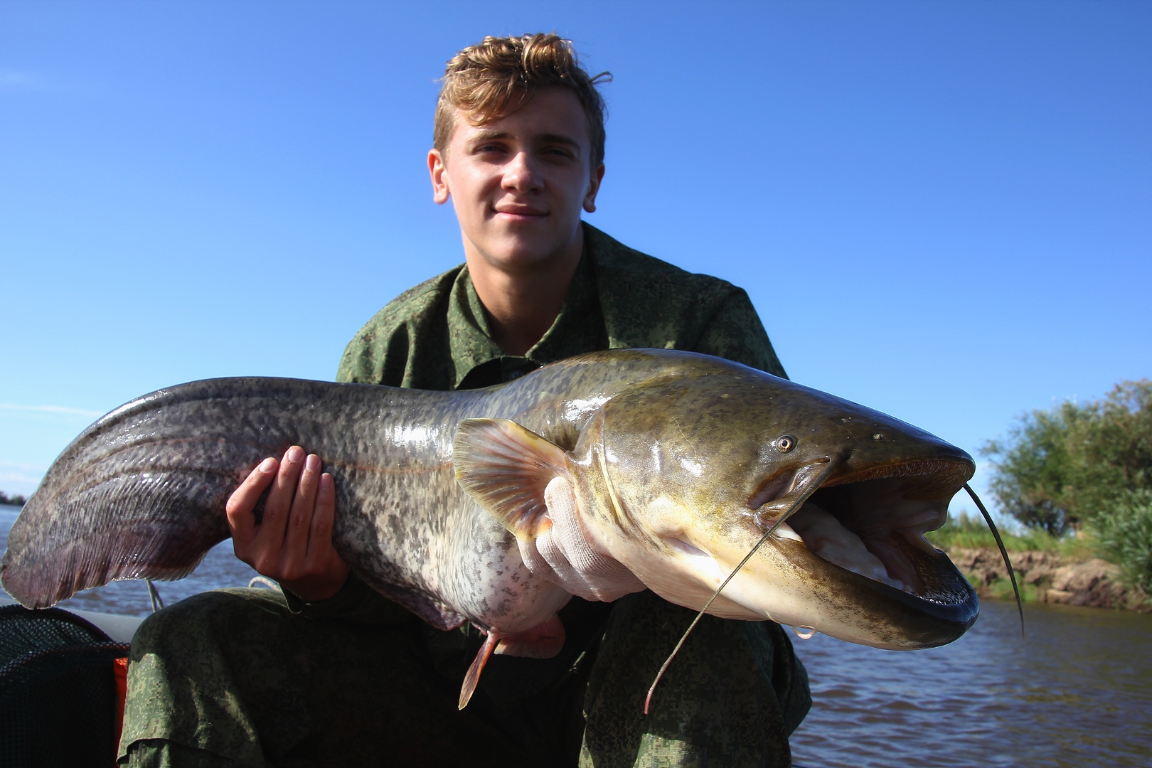 Еще с пару десятков забросов не принесли успеха. Решаю поэкспериментировать. Ставлю достаточно тяжелый джиг, голова 28 гр. резина 3 дюйма. Первый заброс, касание дна, класическая ступенька четко отдающаяся в руку на палке Megabass Blizzard, и резкий удар с оттяжкой по приманке, есть!!! Сом не хочет отрываться от дна, не тороплюсь, пусть погуляет. Шнур Unitika в размере 1.5 не позволяет тянуть напролом, да и палка в дугу, фрикцион катушки повизгивает. Рывки рыбы резкие, но короткие, метров по пять-семь примерно, сдерживаю и подтягиваю обратно, пару раз пришлось окунать спиннинг в воду, сом пер под лодку. Красота, сом ходит у дна кругами, я сижу, глазею по сторонам, закурил, потом достал одной рукой фотоаппарат, попытался сфотать дугу спиннинга, не получилось нормально это сделать, да и сом опять даванул. Минут через десять рыба подустала, дала себя приподнять в полводы (под лодкой 7 метров). Но еще пришлось повозится минут пять пока поднял и завел в подсак.