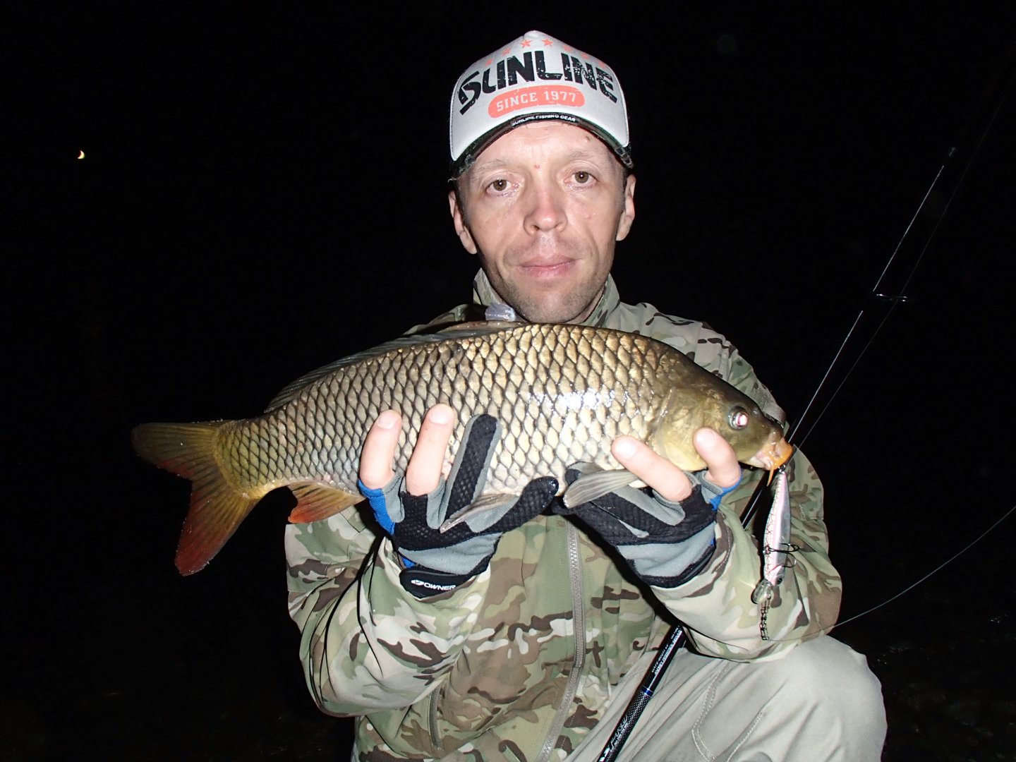 Вечерком после работы выскочил уже практически по темноте немного порыбалить, да и проверить информацию что вчера и позавчера хищник разный буйствовал просто не подетски.. Как выяснилось спустя полчаса, ситуация складывалась точь-в точь как это всегда бывает.."Рыба клюет вчера, завтра, и на том берегу".. Так же рассуждал и мужик сидевший неподалеку на донках.."Вот позавчера в это же время тут кореш на живца двух сомов по 10 кг взял в это же время, я вчера трех поймал, правда поменьше, а сегодня чет то х.. ( ну в общем понятно что имелось ввиду).."..Перекидав практически все что было с собой в этот раз, а взял я в основном проверенные приманки, и не ощутив поклевок, я уже было начал подумывать что пора уже валить домой, ибо толку не будет..Эти мысли прервал слабенький тычок в 88-го "Грэдика"..Я тут же замедлил проводку, сделал пару коротеньких рывков воблером, и следом паузу..В этот самый момент на паузе и последовала уверенная и достаточно злая поклевка..Спиннинг отработал первый достаточно сильный рывок рыбы, после чего взвизгнул фрикцион стравивший несколько метров шнура..Вываживание пришлось делать силовое и накоротке, потому как рыба пошла в сторону донок мужика..По другому вываживать было никак нельзя, собрал бы все в кучу, и донки, и закидушки, и малявочницу, и садок полный касаток..Выведя рыбу из опасной зоны я очень быстро подтянул ее и припарковал к берегу.. Когда я склонился посмотреть что же все таки решило полакомиться 88-м "Грэди Гатсом", то удивлению моему не было предела..Рыбой оказался сазанчик.. Навскидку чуть за килограмм.. Мужик - сосед удивился не меньше меня.."Как это так, сазан да на спиннинг, еще и на пластмассовую рыбку..? Надо будет хлеба намять и на ночь поставить одну донку специально на сазана, ночью по любому крупный подойдет"..:E048:Ну подойдет так подойдет, думаю, надо сфотать, да отпускать.. Фотать пришлось просить мужика..