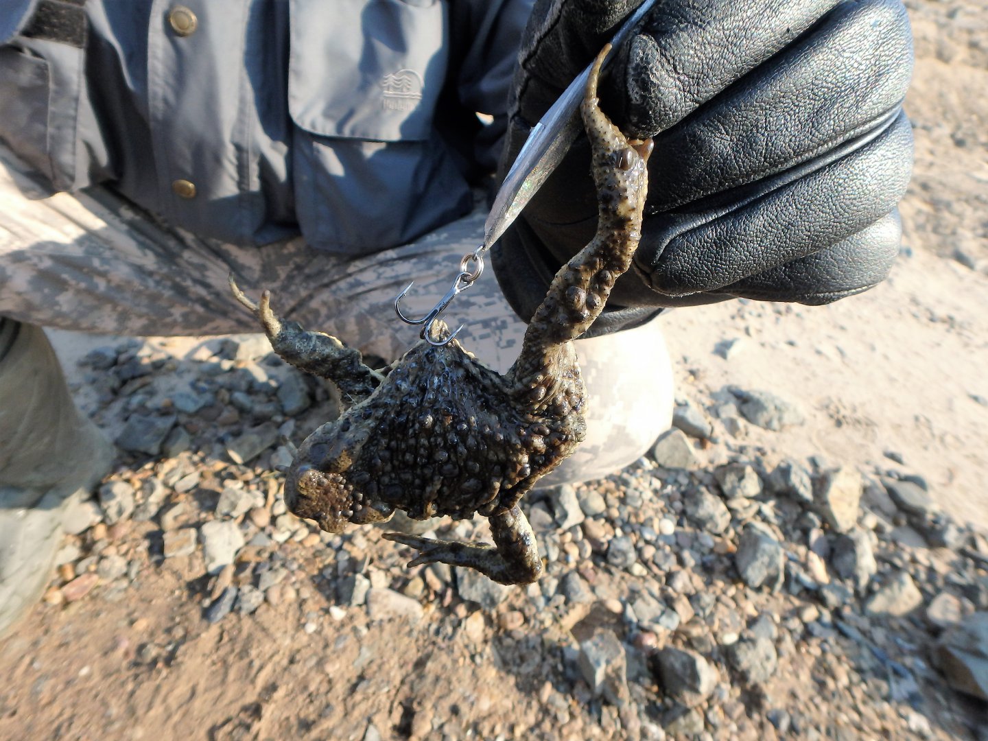 Повторили сегодня вчерашний подвиг Виктора Михалыча.. Подвиг в прямом смысле этого слова, потому как в такой ветер нормальные люди дома сидят..Но мы то не нормальные, мы же спиннингисты.. :E048:Есть вода открытая, значит на рыбалку..Условия ловли.. Берег Амура, ветер западный, порядка 12-15 метров секунду, и как назло западный, и обязательно в лицо.. Соответственно и забросы осуществлялись против ветра, что не всегда позволяло запуливать приманки туда куда надо, до мест стоянки рыбы.. В общем условия еще те, кто оказывался когда либо в подобных, меня поймут.. Ловили сегодня спиннингами длинномерами - 2,70 и 3.00, оснащенными шнуром #1 PE и нанофилом 0,15мм.. С более короткими палочками мы бы только воздухом подышали, потому как рыба стояла в 70-80 метрах от берега, в нормальное то время не всеми палками добросишь, а тут еще и ветрище постоянно дующий.. В течение получаса было тихо.. Потом последовала первая поклевка, и на берегу оказалась.. довольно таки жирненькая жаба..:E074: