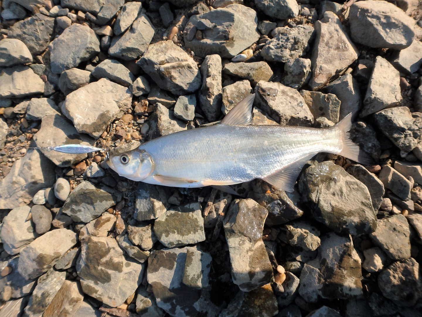 Начал забросы с кастмастера. Летит отлично, леска не замерзает совсем. Да и тепло на улице как то. Солнышко выглянуло, совсем хорошо стало.