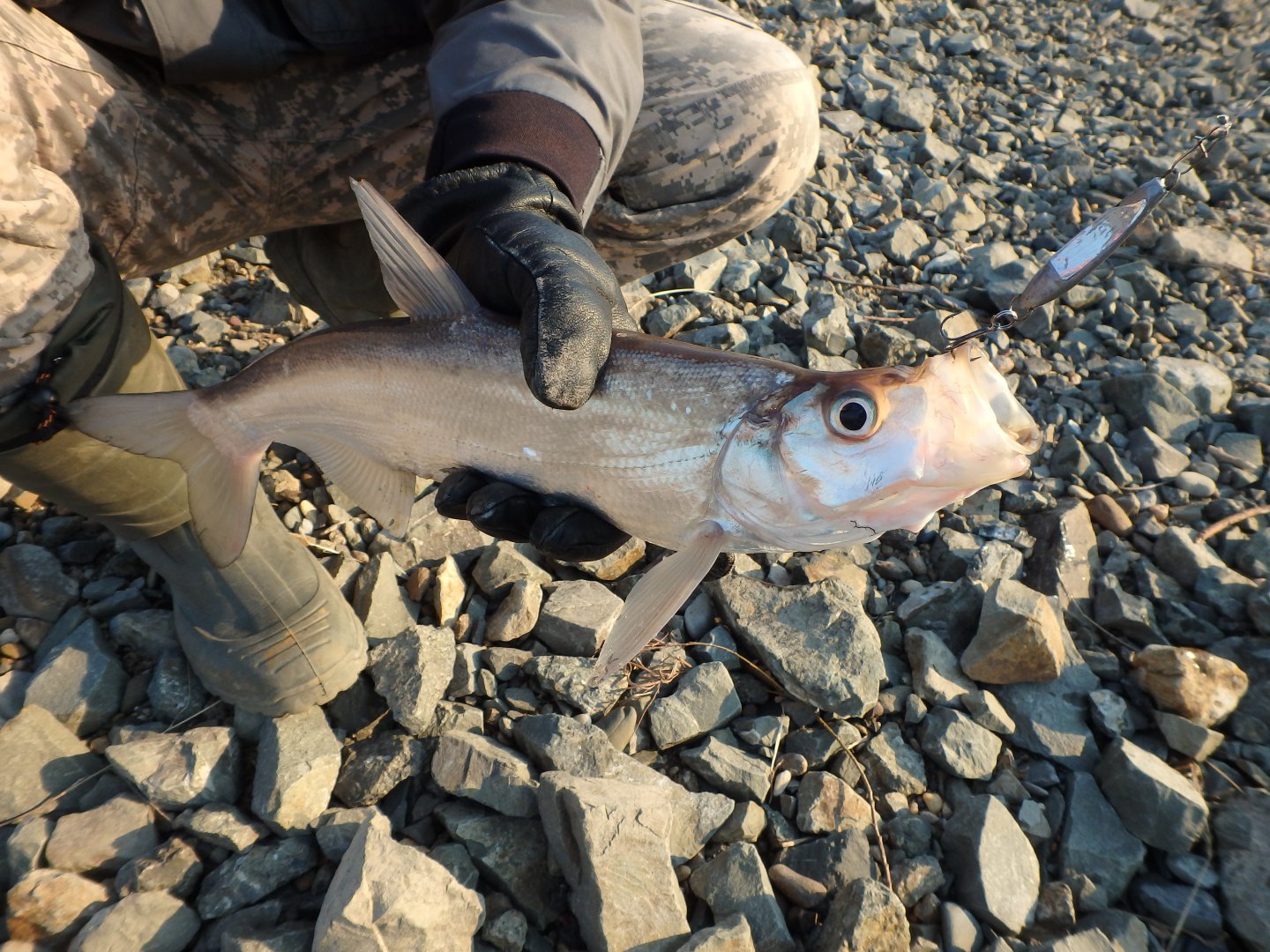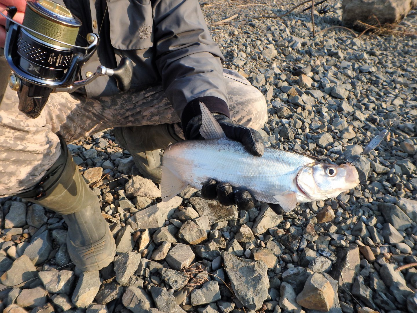 Поклевки уверенные, но на вываживании рыба вялая, сопротивления особого не оказывала, по всей видимости сказывается холодная вода.. Вся пойманная рыба после фотосессии безжалостно топилась..Рыбачили порядка трех часов..К 17.00 ветер усилился, температура стала понижаться, пропускные кольца стали покрываться льдом, да и руки уже стали замерзать даже в перчатках.. В общем мерзнуть мы не стали, и двинули по домам..В принципе рыбалка удалась несмотря на те условия в которых она проходила..Рыба есть, и была поймана, воздухом подышали знатно, позитивчиком зарядились, возможно что уже в крайний раз в этом сезоне спиннинговой рыбалки на Амуре.. Хотя кто его знает..:E048: Но на всякий случай хочу поздравить всех спиннингистов, независимо от возраста и пола с завершением сезона, и пожелать всегда натянутых шнуров и лесок, побольше злых поклевок, трофейных экземпляров, приятного уху визга фрикционов, и традиционного НХНЧ!