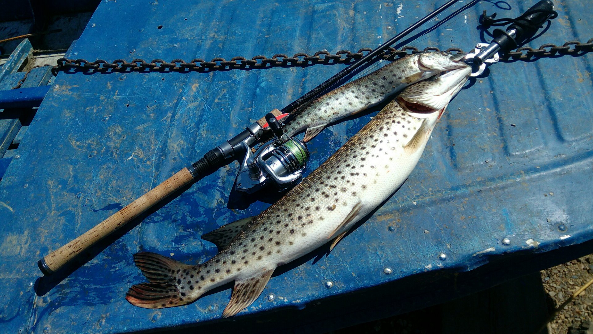 Всем привет. Сегодня отличный день и часть его отдана спиннингу. С верхоглядом не сложилось: на берег прибыл поздновато да и с ветром бороться внутренне не был готов. Зато с щукой все получилось на все 100, как говорится "на каждом забросе". Все щукены знатные летчики: выпрыгивали из воды, трясли головой, при этом у многих получилось избавиться от тройника. В общем, набил руку. У последней рыбы такие фокусы не прошли: фрикцион настроен, при попытке прыгнуть — спин к воде, не торопимся. 5 минут вываживания и 2 кг щуки на берегу перед объективом. Пришлось забирать, в т.ч. пару мелких, т.к. тройник порвал жабры. Да, еще был "разминочный" сом также на 2кг.