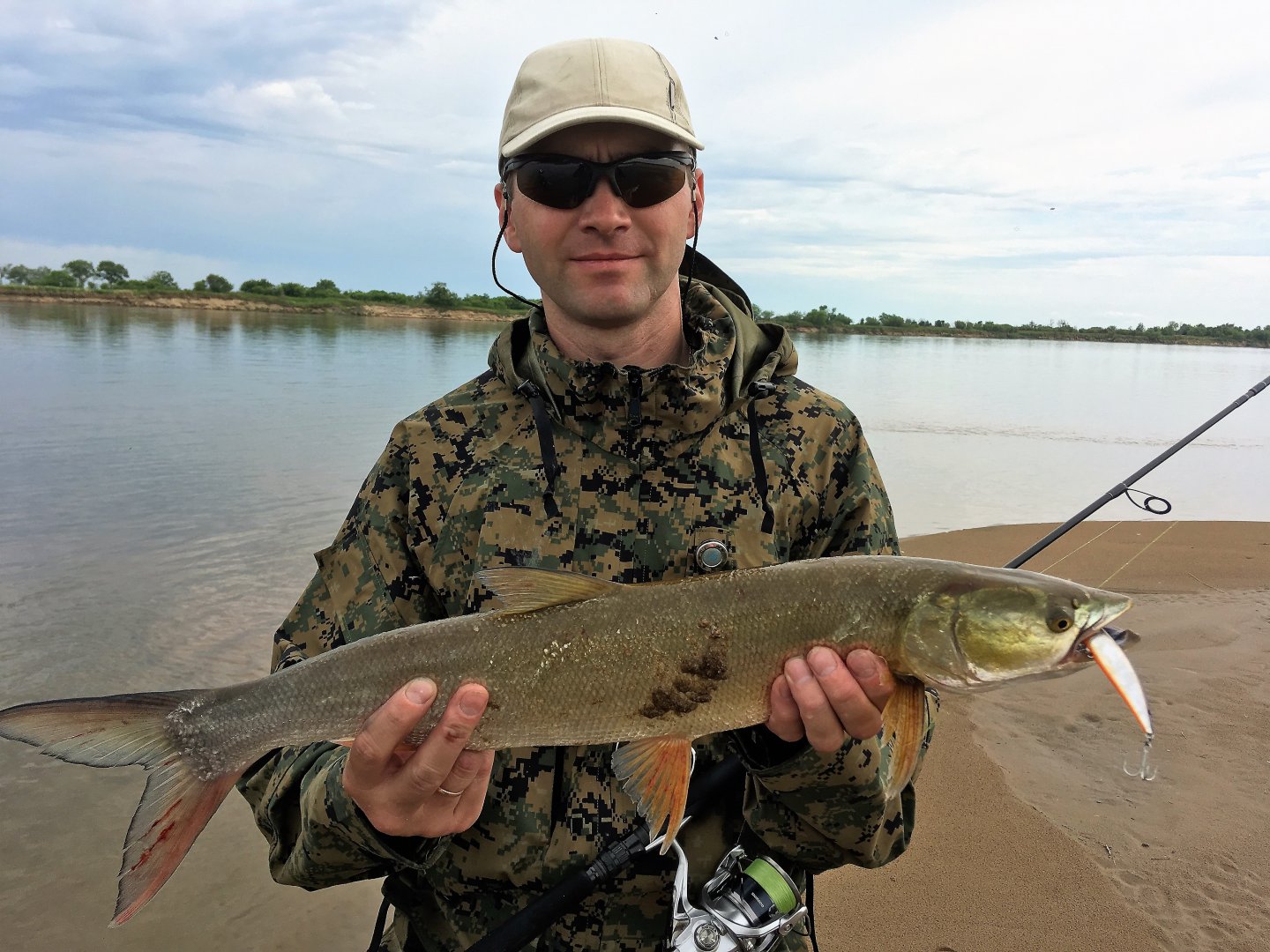 Под занавес нашей вылазки стала поклевка у Алексея.минут цать под визг фрикциона....борьба была мучительно долгой...шнурик тонкий плюс течение...форсировать никак низя...короче весь остаток вечерки провозились с сомиком наерно под 10кило...