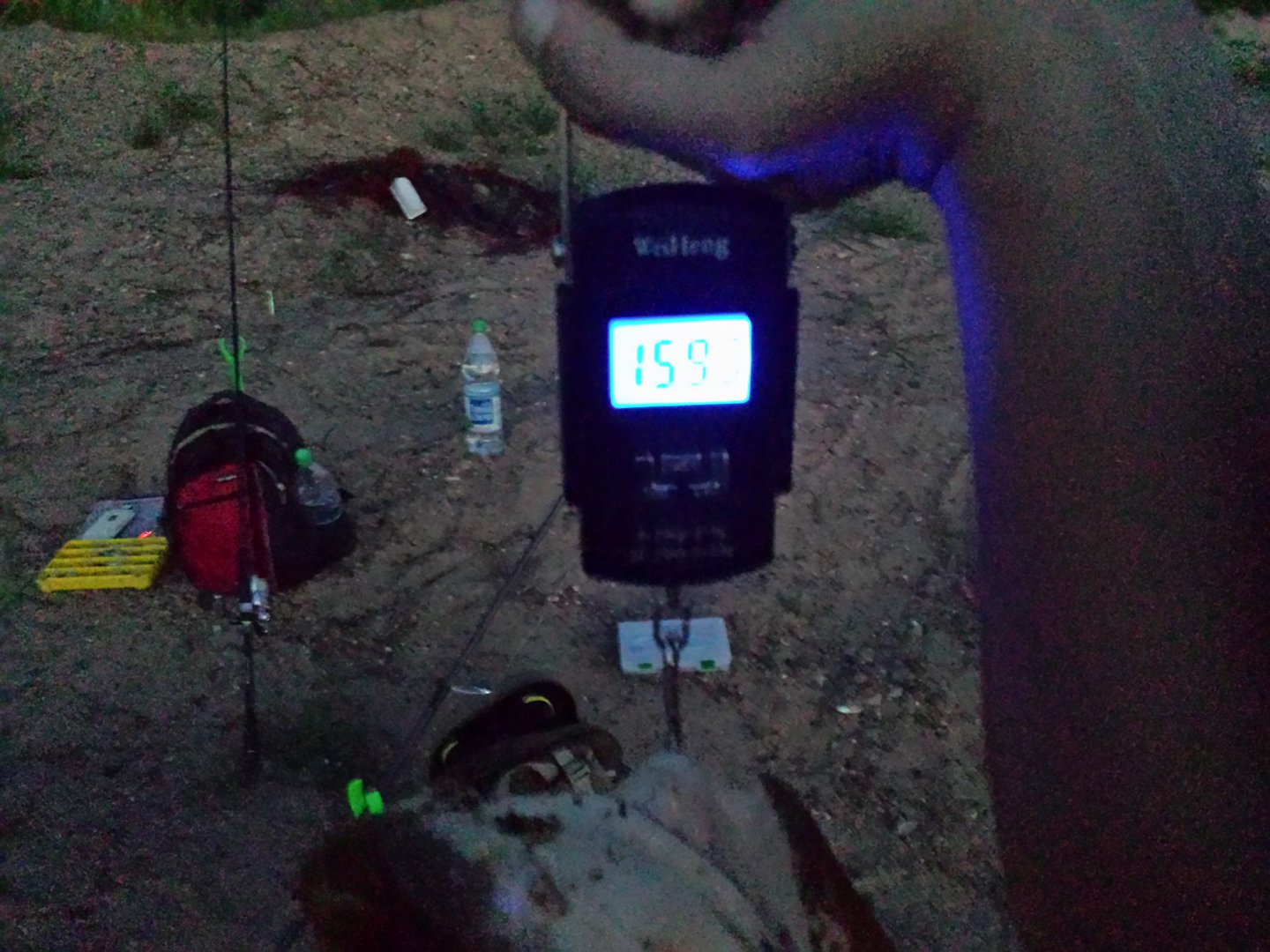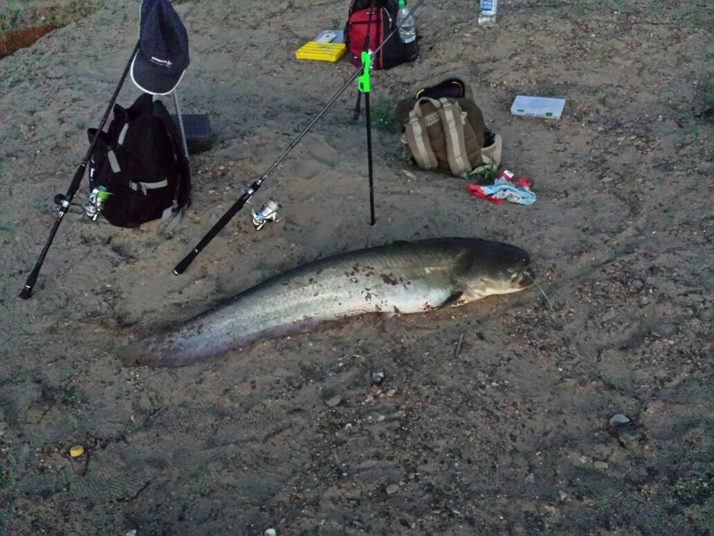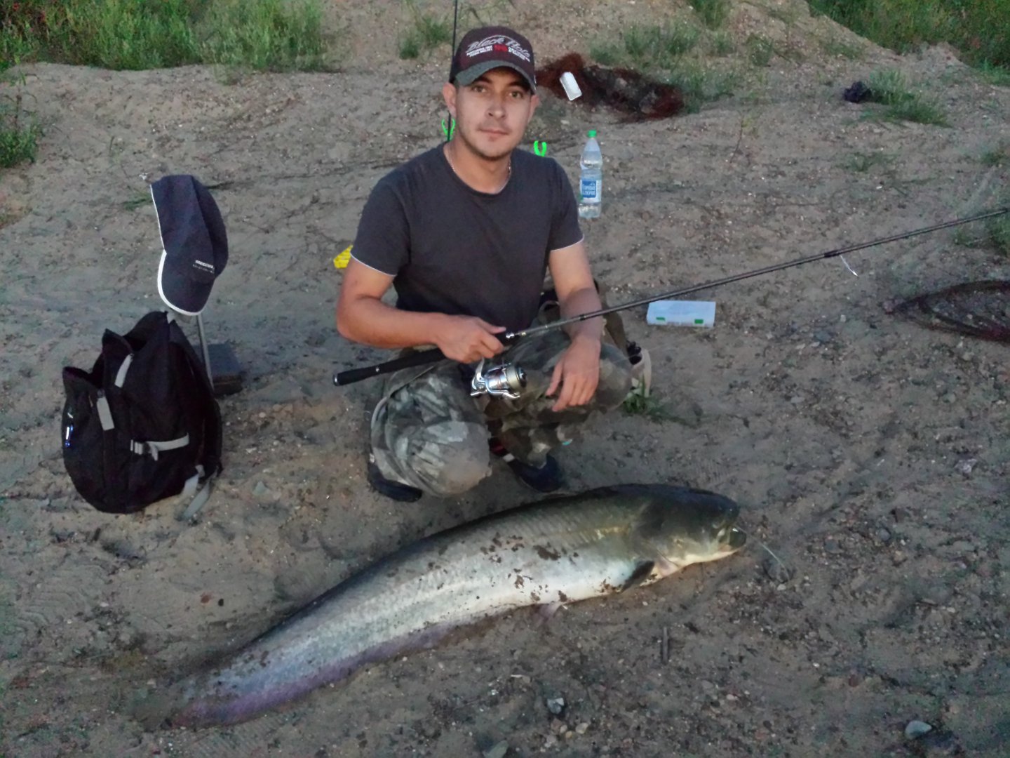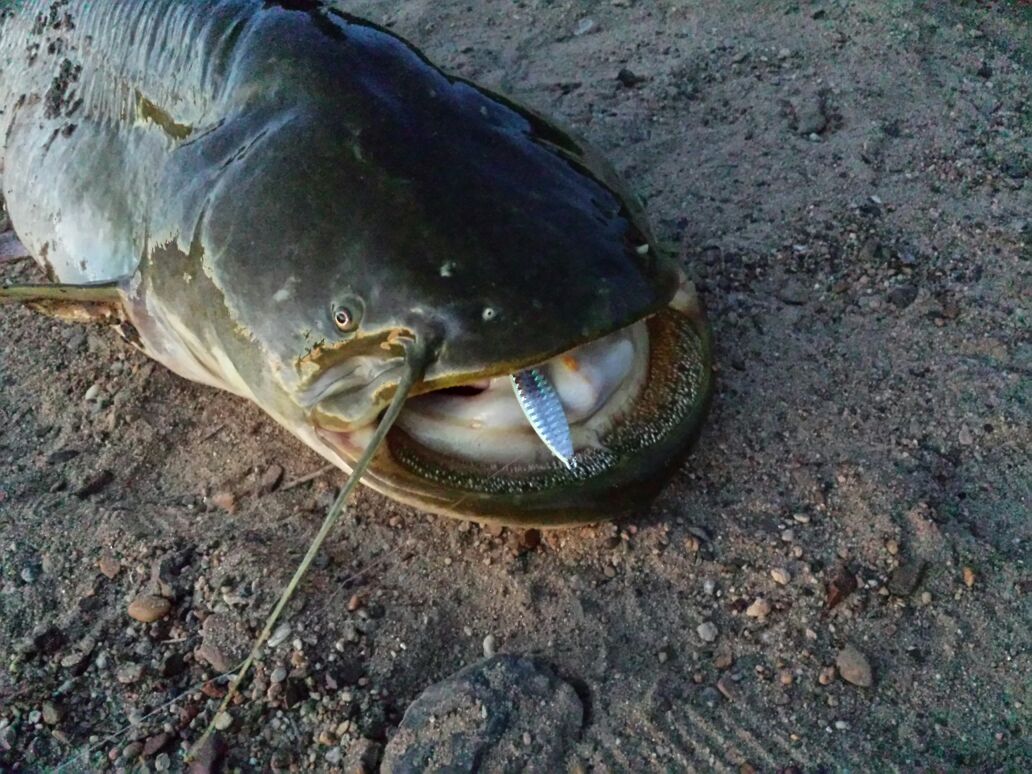 После пару часовой рыбалки клев подутих на пол часа, не всплесков не тычков в приманки. Но на одном из забросов при проводке почувствовал удар рыбы. С первых секунд фрикцион начал визжать, а спиннинг прогибаться в дугу. Подумал, что забагрил сазана или толстолоба , но по рывкам и сопротивлениям было не понятно что за рыб сел на пилькер. Вываживая ближе к берегу рыб вывернулся на поверхность, где мы и увидели сома с метр длиной. Сопротивление было достойным . сложность составляло должным образом принять его, берег был не айс. Хорошо, что был небольшой подсак , куда его и припарковали.один бы я его не взял, пришлось бы резать шнур что бы не мучатся, а так спасибо Виктору и Алексею. Адреналинчику все хапнули. Сом потянул на 16 кг . Вот такое вечернее тестирование спиннинга вышло в этот раз.