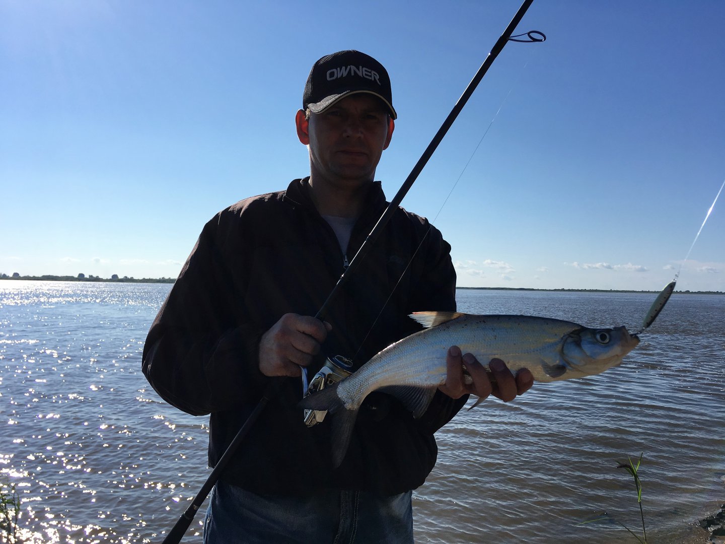 На сегодня рыбалок запланировано не было, но получилось так что один мой близкий знакомый который сейчас проездом на три дня в Хабаровске изъявил огромное желание половить Амурской рыбки.. Ну не отказывать же.. Выезжать далеко не было смысла, поэтому рыбалку было решено провести в городской черте.. По прибытию на место увидели "почетного форумчанина" у которого как раз в этот момент спиннинг уверенно отрабатывал и гасил рывки бойкой рыбы.. Через пару минут "килошник"- верхогляд схвативший приманку на выбросе предстал перед объективом фотокамеры..