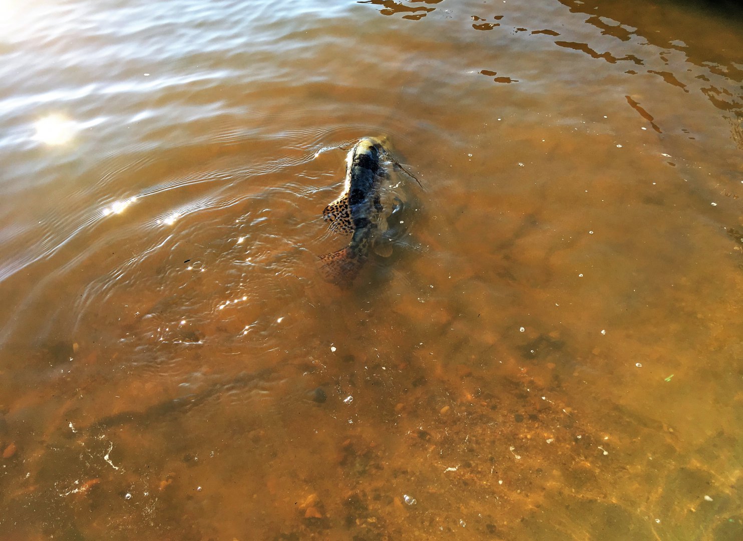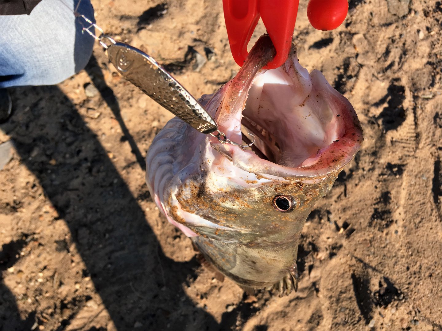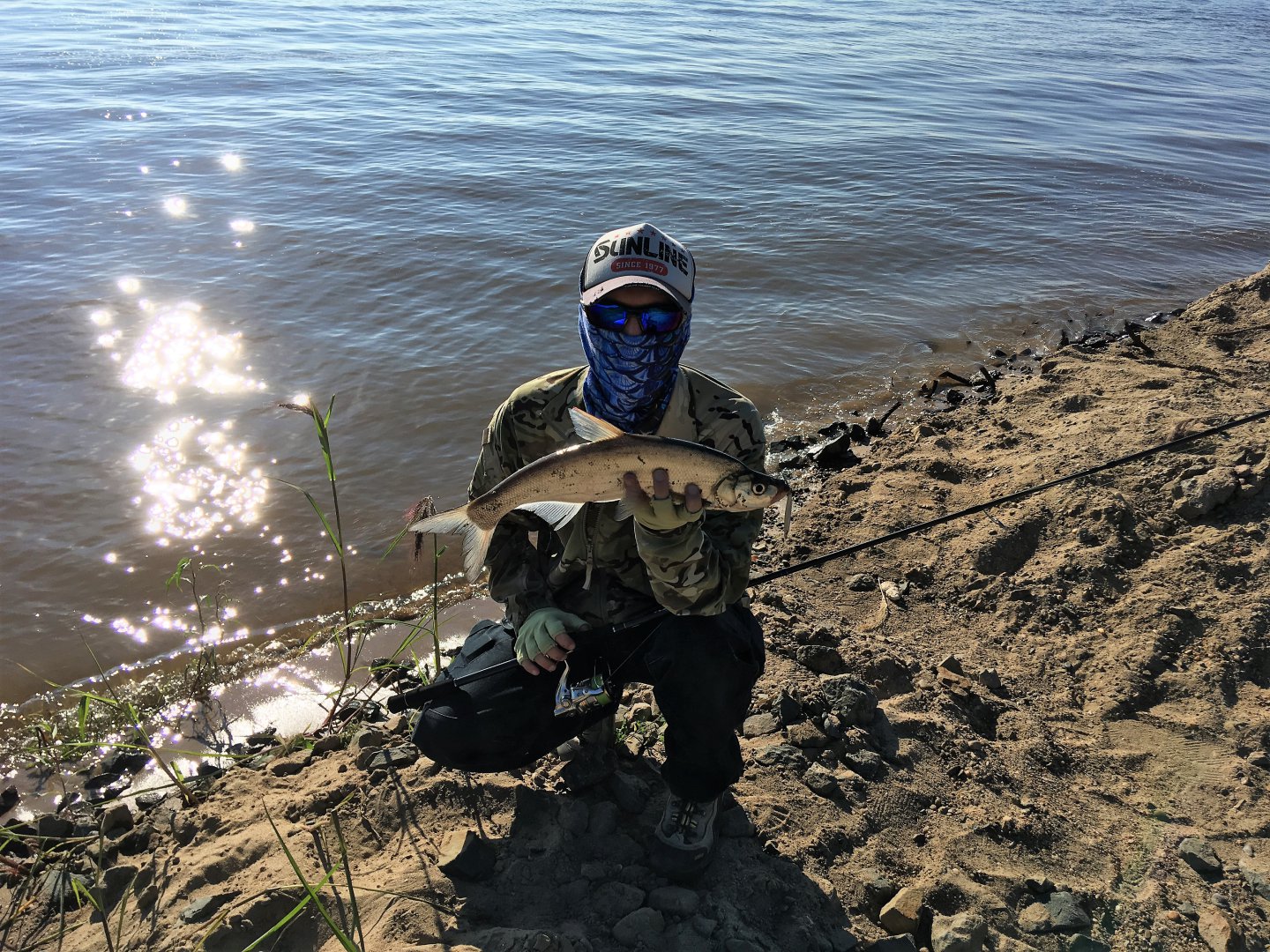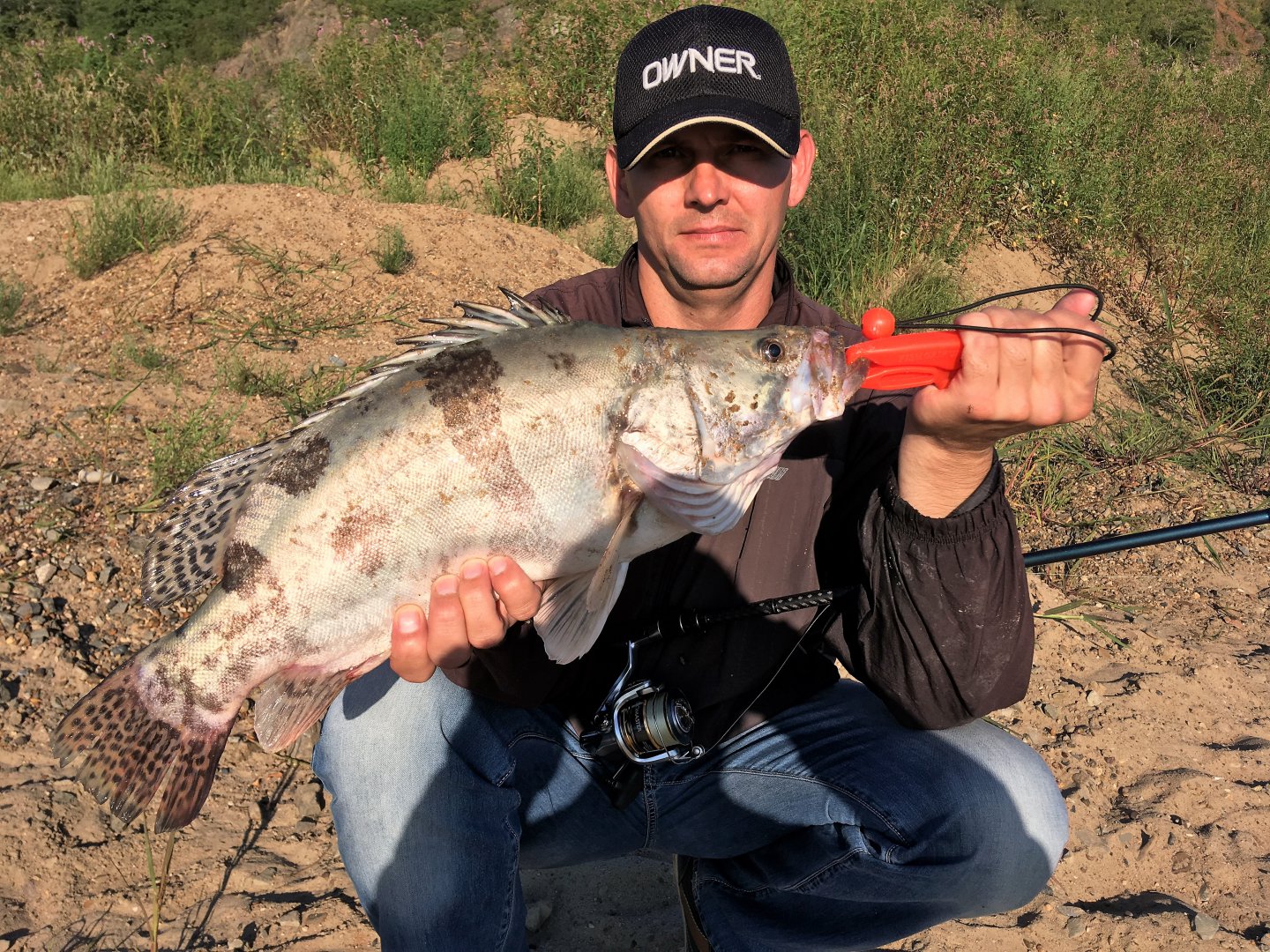 На одном из забросов у Виктора поледовала четкая, мощная и явно не верхогляжья поклевка.. Удилище согнулось, завизжал фрикцион отдавший сразу порядка 20 метров шнура.. Думали сом, который сейчас частый гость в этих местах, но как оказалось позже, мы очень сильно ошибались.. 21-граммового Коттона изволил закушать.. довольно не маленький "окушок".. Вот так сюрприз! Удивлению нашему не было предела, но больше всех был изумлен мой товарищ который ауху до этого видел только лишь на картинках и фото в соц сетях.. И вот она, диковинная для человека с запада рыба живьем и собственной персоной..