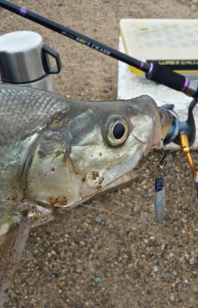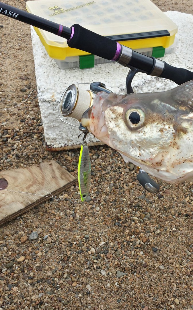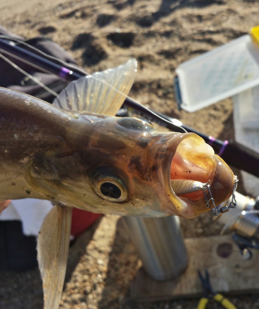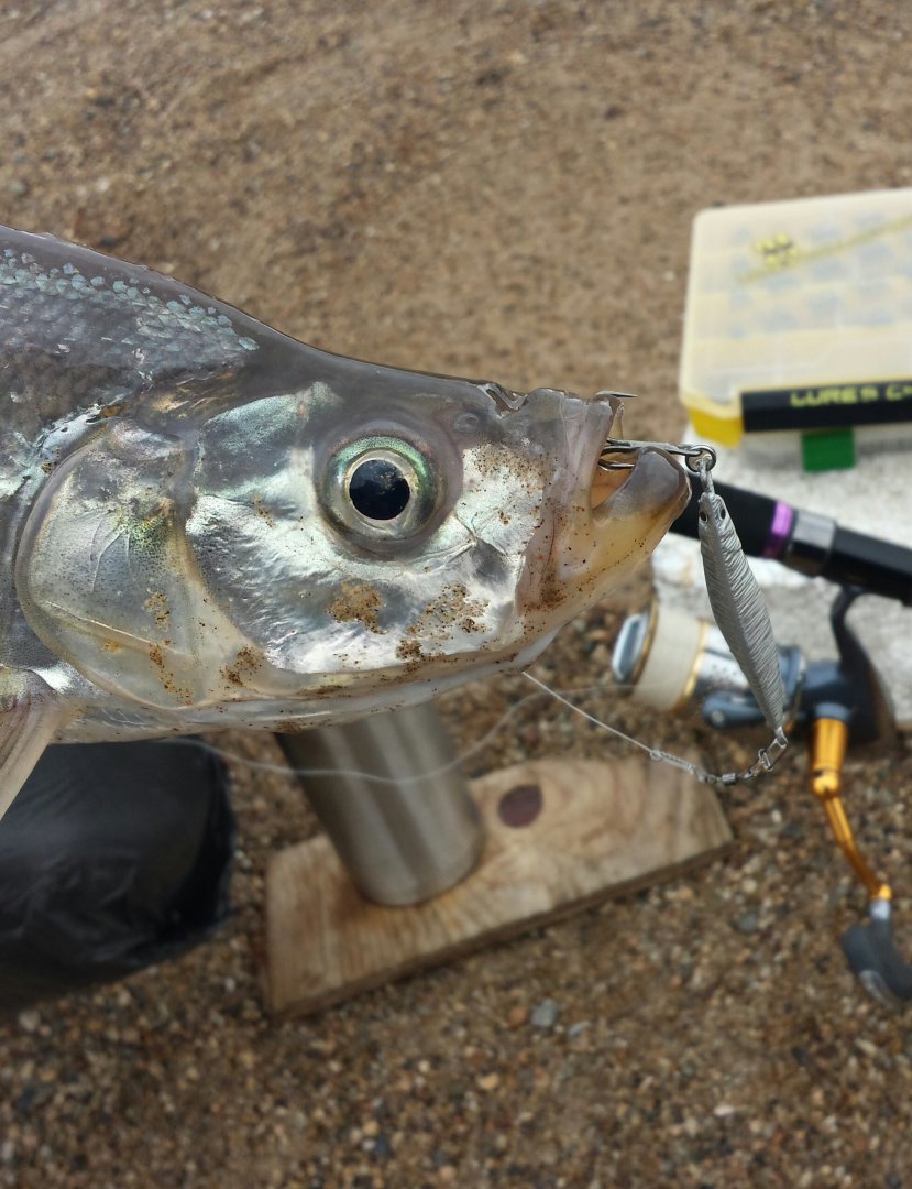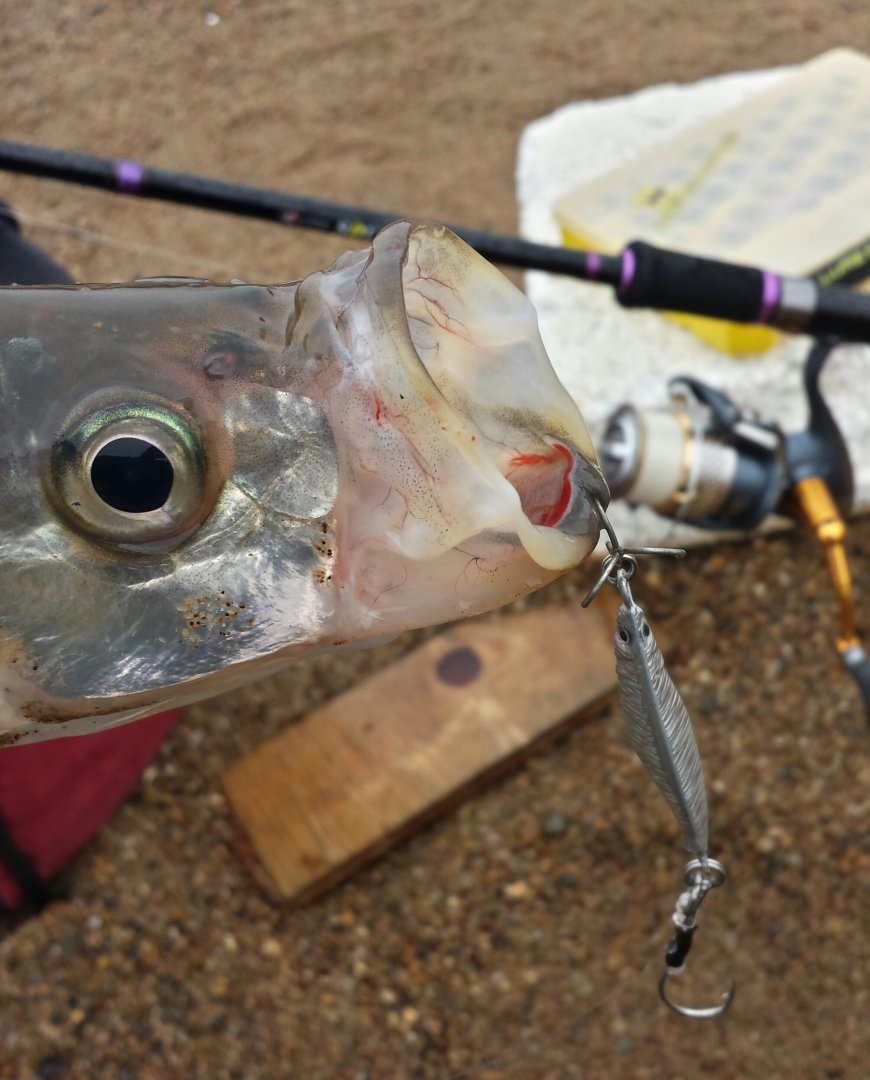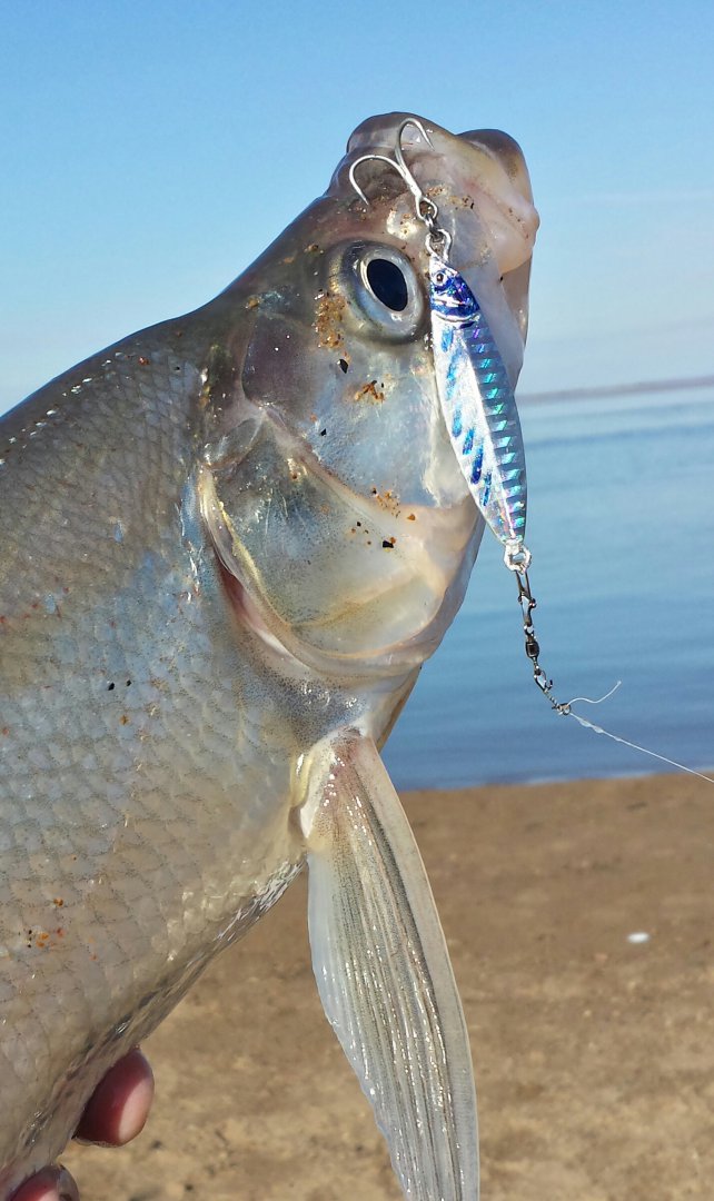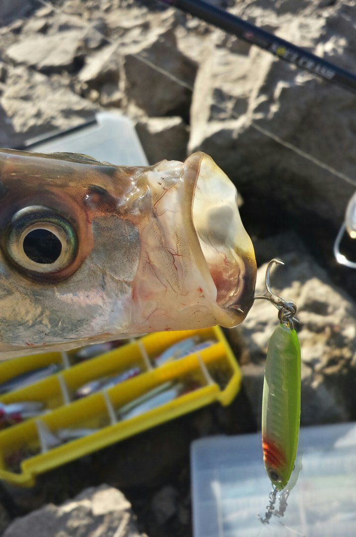 Спиинг мощный.приманки сугубо 30граммовые пилькеры.иначе не добросишь до места стоянки рып.проводка очень медленная и вот результат.....