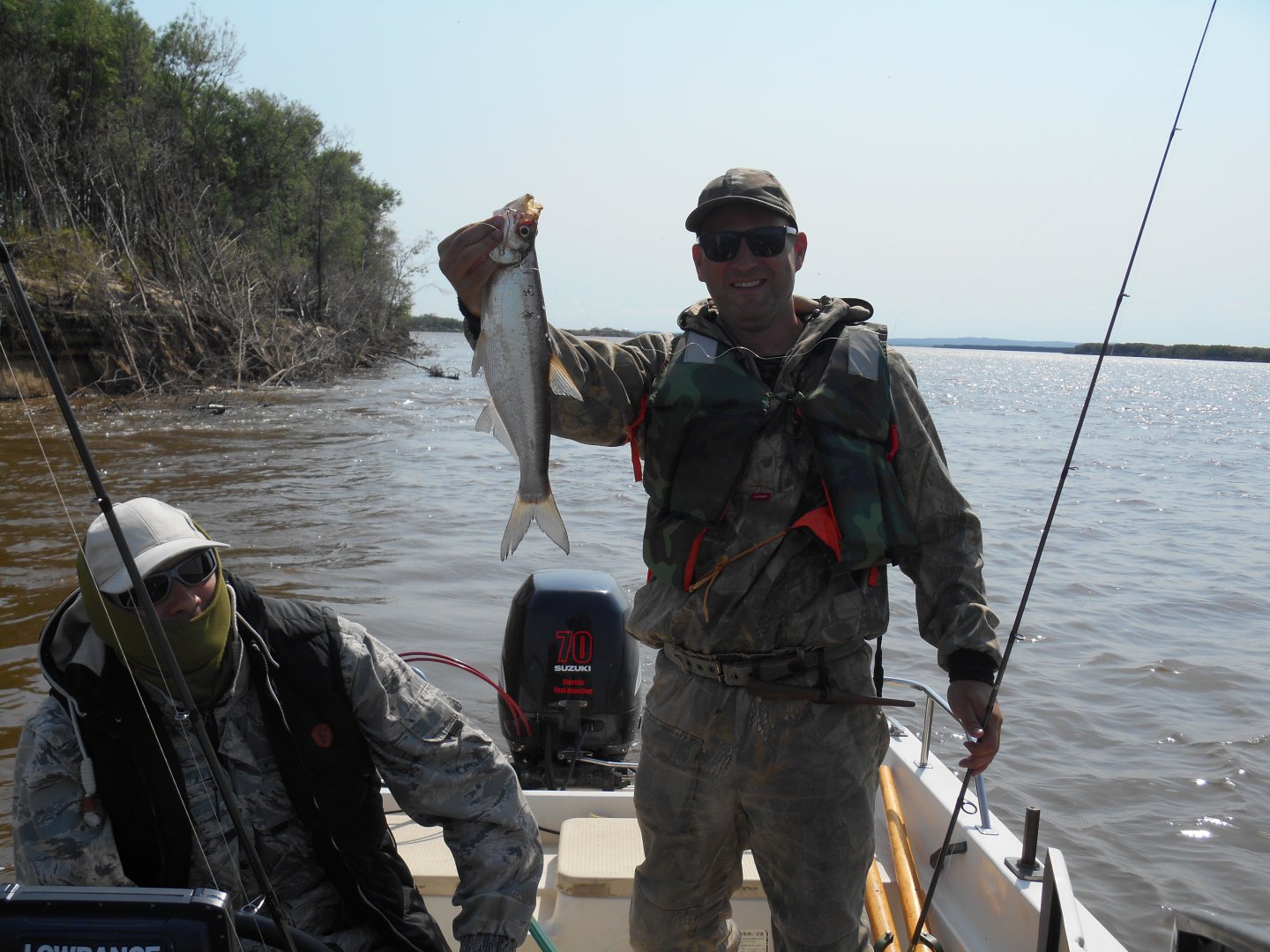Вода конечно грязная и прибывает. Ну что на старт включай форсаж и полетели. После ПВХ конечно техника просто огонь и времени намного меньше уходит на спуск лодки на воду, АБАЛДЕННО одним словом. Начинаем проверять места в которых неплохо ловили в прошлом году. А все слегка изменилось, где-то закоряжило, где-то размыло, где-то занесло. Пытаемся ловить рыбу учитывая условия каждого места. Одна точка, вторая-ноль. Меняем приманки, способы, горизонты проводки-ноль. Видимо с повышением уровня воды который продолжался рыба отошла в другие места. Но тут на очередной точке Сереге удалось соблазнить хищника из под коряжки на кастмастер. Значит рыба есть, размер только очень трофейный:E048::E048:. С почином. Мальца домой подрастать