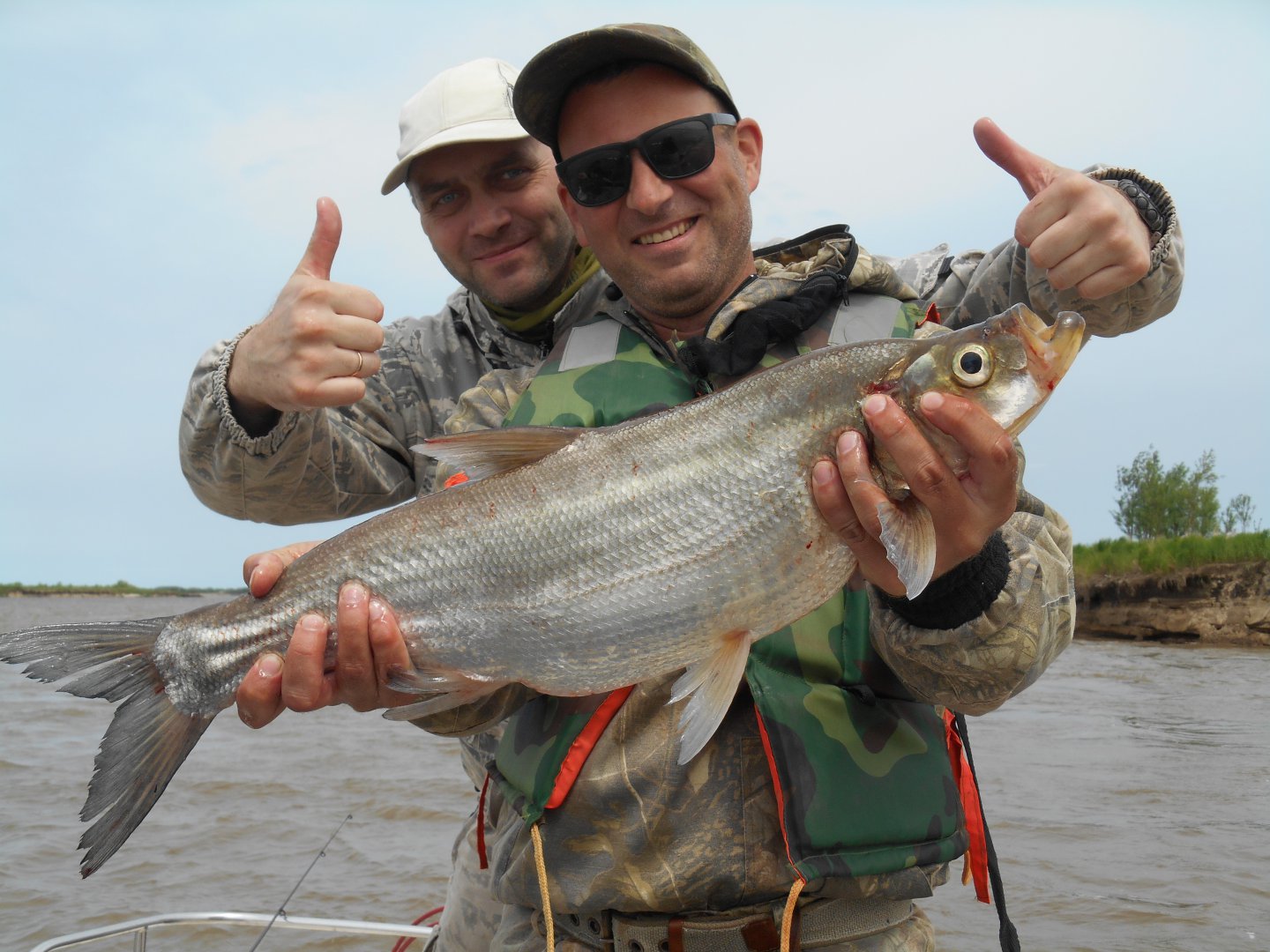 И понеслось, в течении часа с этой точки было снято 15 хвостов, размер от двух до трех кило. Потом задул сильный боковой ветер, солнце зашло за облака и клев как обрубило. Решаем сделать по несколько забросов и сниматься с якоря. И тут Сергей который все это время наблюдал как мы с Витьком таскаем рыбу отличился, ЕСТЬ. Борьба и верхоглазый под трешку припаркован в подсак