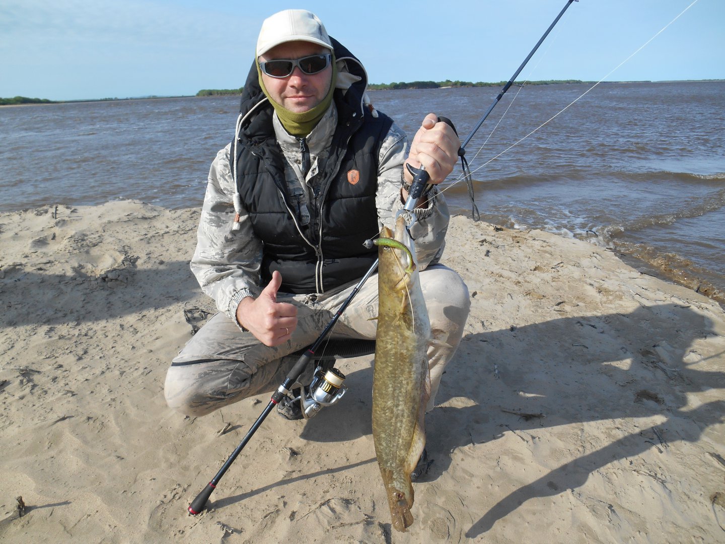 Два дня провели на Амурских просторах в поисках рыбы. Рыбалка была слабенькая. Вода в Амуре мутная несёт разный мусор, как итог за целый день в зачёте два небольших верхогляда. Утром уже не рассчитывая на поимку рыбы на одной из проводок на паузе следует удар и мощная потяжка. Сом схватил 28 граммовый кастмастер, и с силой небольшого трактора поплыл на глубину, сматывая метры лески под визг фрикциона. Спиннинг и катушка отработали отлично и позволили одолеть этого сома. После фото-сессии сом был отпущен в родную стихию.