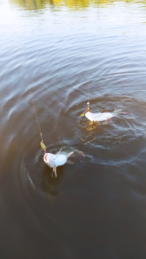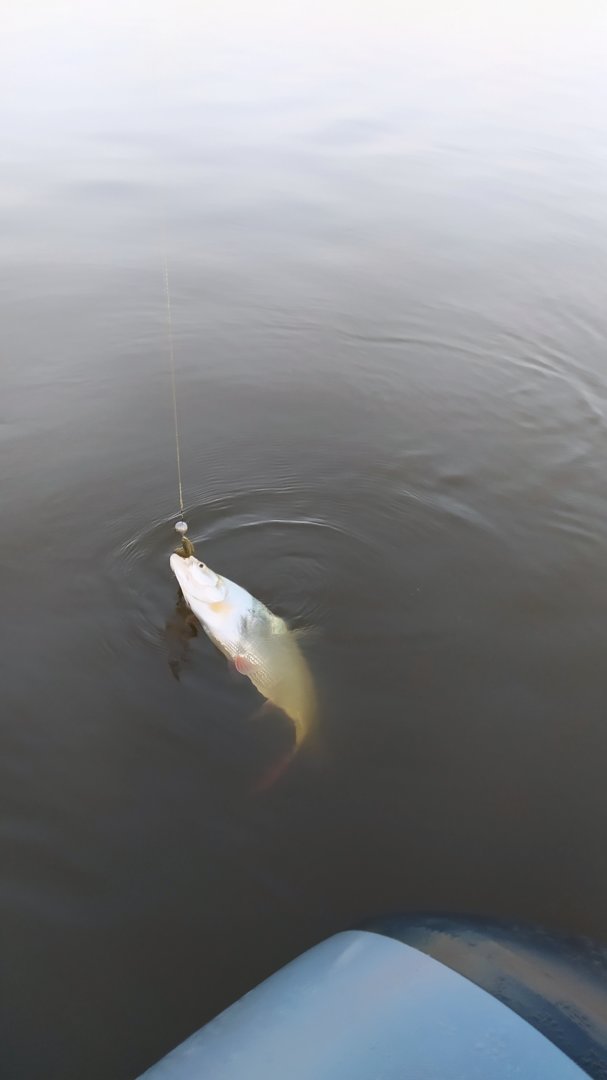 В лодку не поднимаю, чтобы не было грязи, фотографирую в воде, спин поперек лодки положил, воблер соответственно в воде был и на течении начал играть, тут бах поклевка, хорошо спин катушкой за что то притормозил и я успел его схватить, перед сокрушительным фиаско.