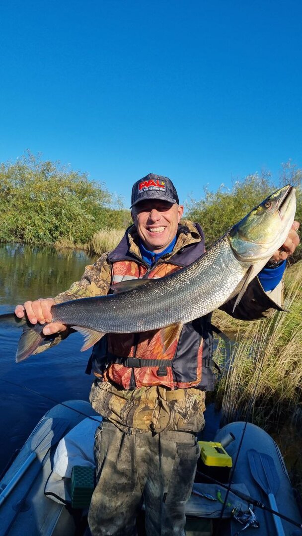Искупав весь свой немалый пилькерный арсенал, и поняв что "железо" сегодня точно не в приоритете, решил перейти на силикон.. Оснастил одну из недавно приобретенных интересной формы цветных «голов» кислотным виброхвостом и запулил ее подальше, насколько хватило сил.. Не успел подобрать слабину со шнура как последовал звонкий щелчок заставивший от неожиданности всечь что называется от души.. Спиннинг принял форму правильной параболы, фрикцион призывно завизжал.. Ну наконец - то! Непродолжительное вываживание и рыба у берега.. Ей оказался неплохой судак.. Прикольно! И первый же вопрос самому себе - что он делал практически под поверхностью и клюнул как обычно клюет верхогляд или краснопер? Вопрос этот остался нераскрытым.. Ну да ладно, главное что уже не в компании с дурно пахнущим зверьком..