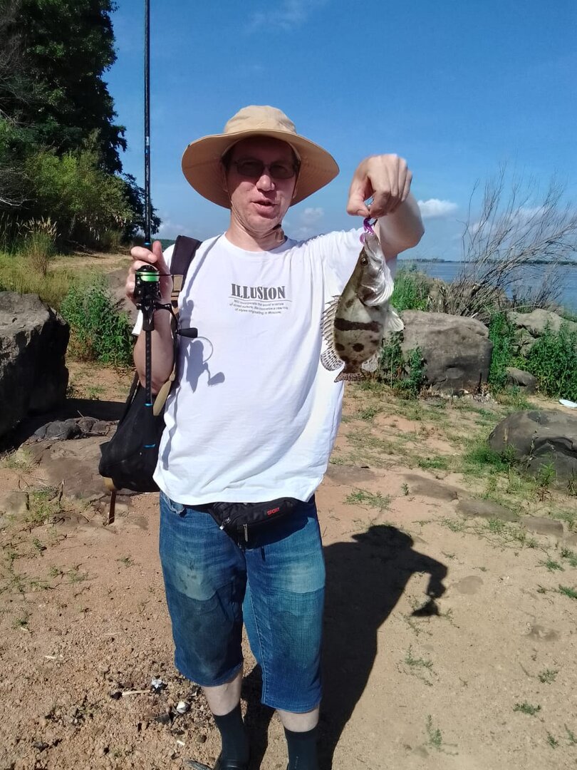 Тем временем справа встали два карасятника. Слева Ж заправски управляется своими «крокодилами». Сразу видно взята не для антуражу, а по делу. Размявшись немного лайтом с пилкерами, перехожу на ультралайт. В таких условиях хоть бы малявку какую поймать. Перебираю яркие, более заметные в мутной воде блёсенки. Ни одного подхода. Наконец дошло дело до перламутровой, с розовыми краями, прогонистой блесны на 5,5 гр. И, какой удар! И сразу давит! Опять сом? Не пойму. Подтянул чуток фрикцион, уж больно много выматывает. Потом ещё подтянул. Борьба! Ультрик в дугу, карасятник справа очумело смотрит на нашу бойню. Вспоминаю про «нужно выкачивать спиннингом, а не катушкой». Получается 50/50. Показалась бочина и верхний плавник. Верхогляд! Да какой огро-омный! Точно не меньше трёхи! Как же я его буду … Дзинь! А-а-а-а-а-а-а-а-а-а!!!