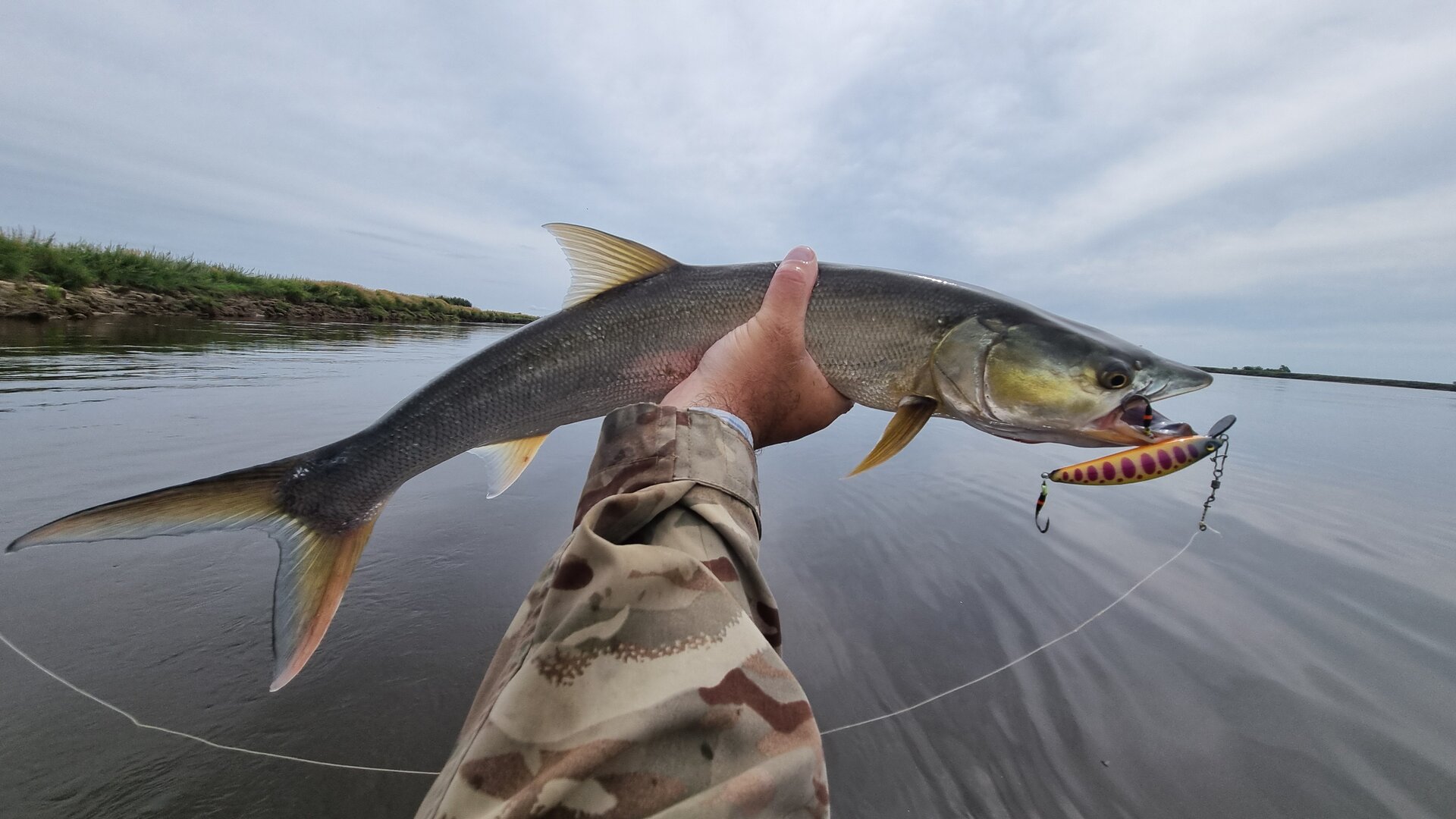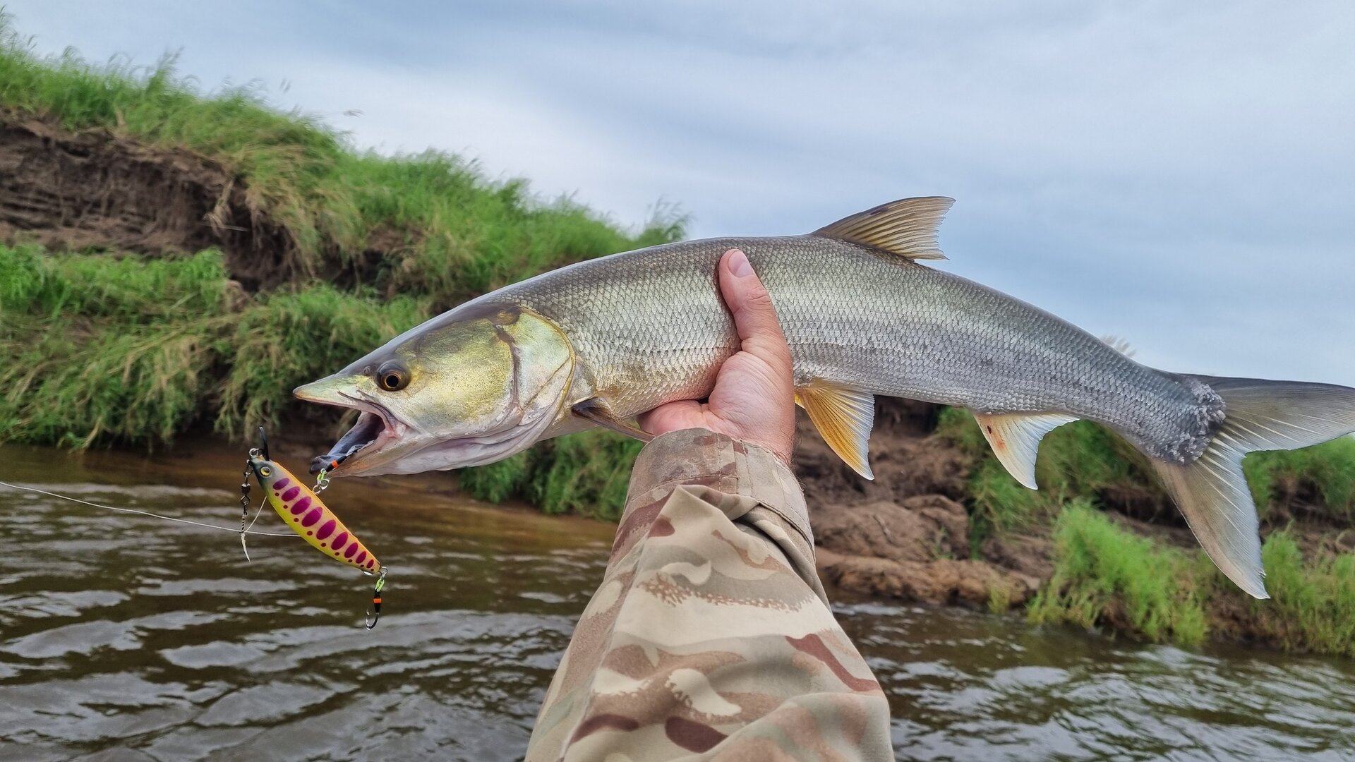 Пузатая красотка серьезного размера позирует на камеру и отпускается по своим нерестовым делам..