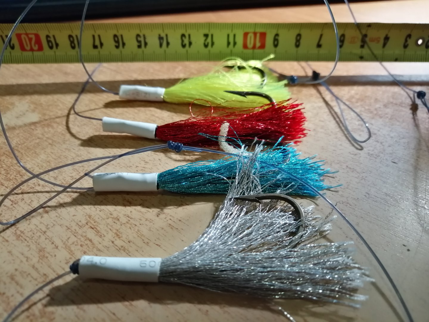 Да нет никакой тайны, просто снасти в гараже, а я с выходных там не был. Когда заеду, то сфотографирую, а так обычные мушки, и блестящие и с кембриком на одинарных и двойниках, ничего сложного.
