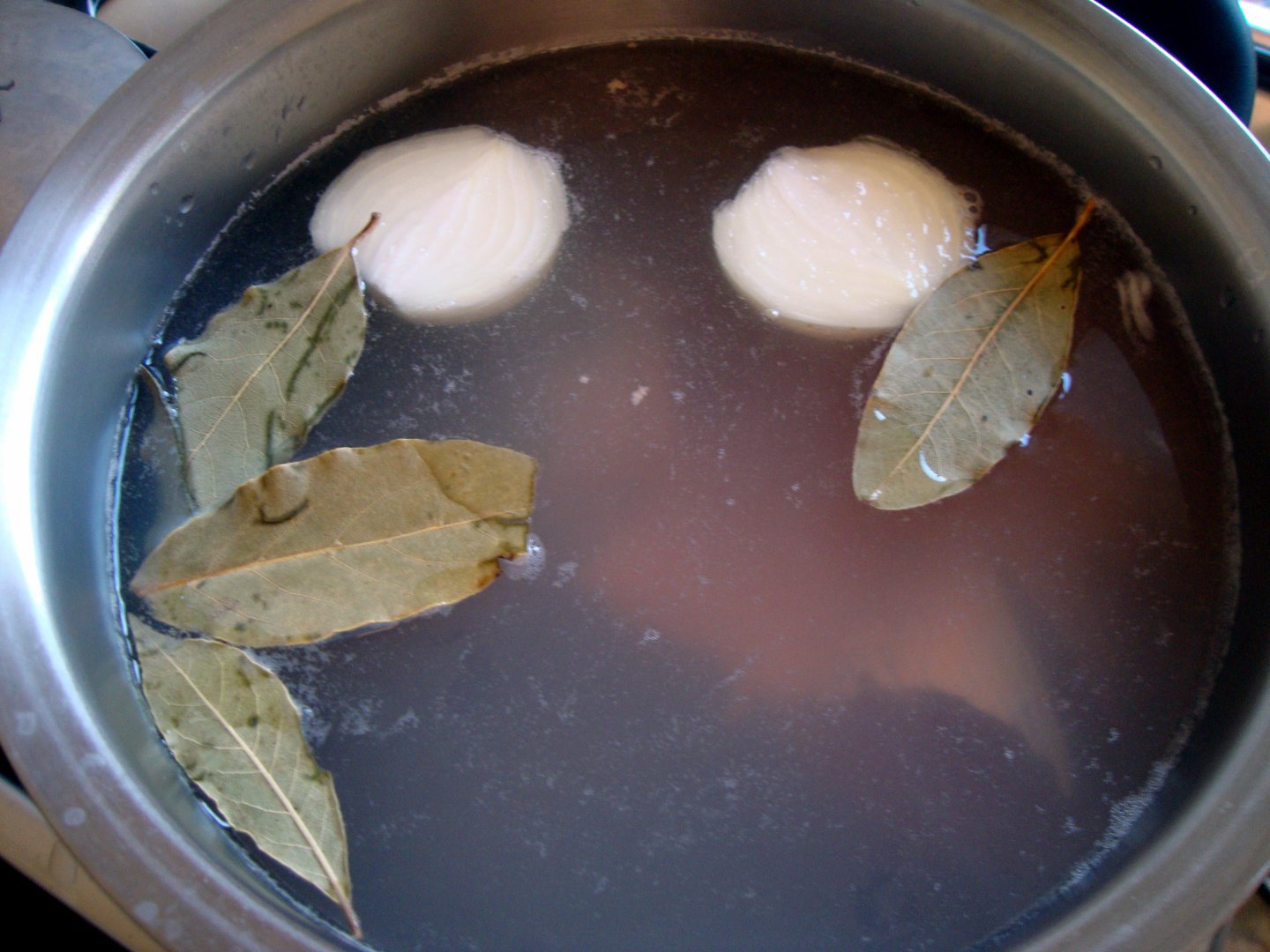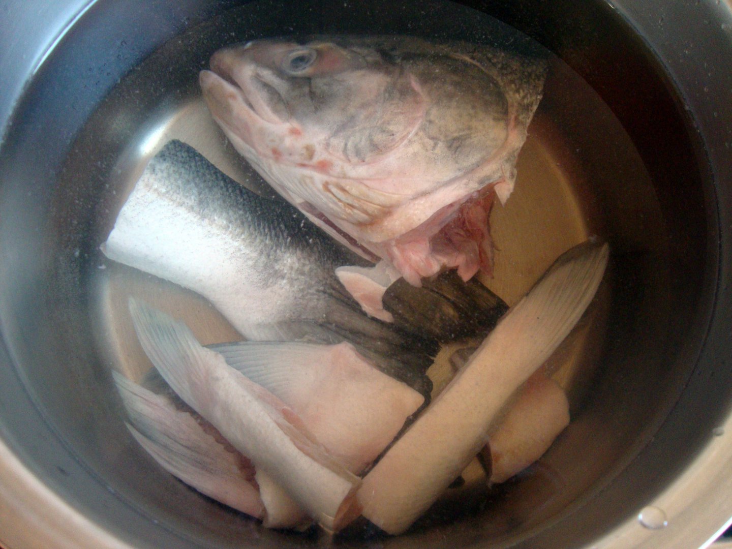 Из головы, хвоста и плавников (+ лук репчатый, лавровый лист и перец горошек) варим бульон.