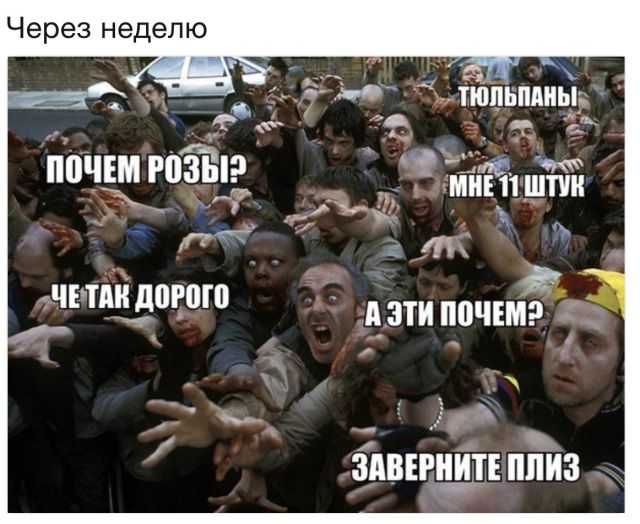 Пару лет назад наблюдал на цветочном рынке на Заводской. Мужик бегает, как полоумный, от микрика к микрику (а дело уж к обеду, остатки остались), и орет: "Розы! Розы! Розы!". А нету. Ему кто-то говорит: "Вон, гладиолусы возьми, вон там орхидеи есть!". А он: "Ты что? Развод! Розы! Розы!"...