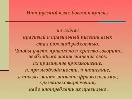 Писатели, поэты, учёные, филологи, говорившие на русском, очень любили свой язык. Славили его своими произведениями, показывали своим читателям его красоту и лаконичность, красочность, разнообразие и богатство. Русский язык достоин любви и уважения от каждого носителя, достоин уважения, сохранения и развития.©
