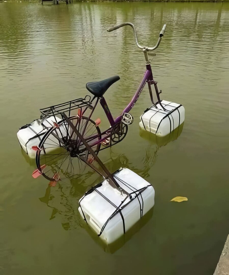 Не успеет вода стечь... Седок либо вперёд, либо назад и вправо завалится не успев педали крутнуть. Ну это при условии, что багажник выдержит - ведь к нему все прихреначено...