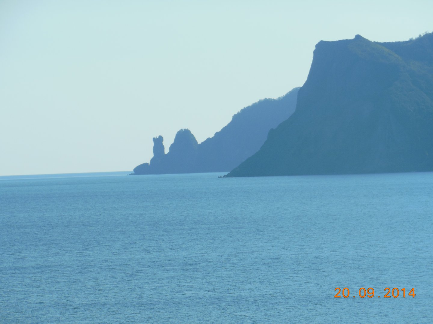 Никакого бы приключения не получилось если-бы у нас был мотор! С ним бы мы спокойно оттарахтели к берегу. А так, можно даже сказать сказать создалась экстремальная ситуация. Мы находились напротив бухты Старка в пяти километрах от берега, ветер дул с берега в сторону Сахалина, ну и мы дрейфовали туда же. Начальные расчеты сделанные в панике были неутешительны, но потом успокоившись мы решили выгребать против ветра по самому короткому расстоянию к берегу. Через два часа ветер стих ну и собственно тогда и были сделаны эти фотографии. Описываю это происшествие вкратце, так как все подробности заняли несколько страниц. Сейчас я не жалею, что попали в такую ситуацию, теперь мы знаем что и как делать в таких случаях. Ну и если не дай бог это произойдет во второй раз, будет уже не так страшно, так как первый раз уже был. Продолжаю дальше. До берега мы догребли за пять часов. Причаливали уже в мертвый штиль. Починку отложили на следующий день, разожгли костёр наелись и завалились спать. Правда Сашка на нервной почве натаскал недельный запас дров.
