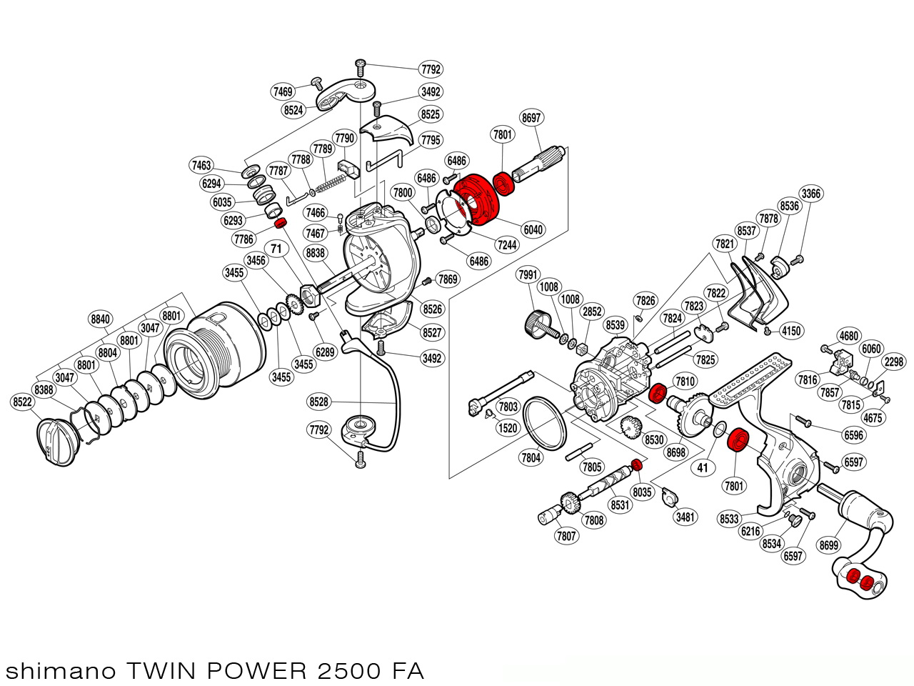 Серия FA действительно некое продолжение Японской версии TwinPower 02. Однако, в Симановской классификации отдельно была силовая версия катушек (вплоть до 2009 года). Т.е. были простые 1000-3000 и PG c HG 4000 -8000 Твины соответствующие своему назначению. Итак? что имеем в FA: пластмассовый корпус, пластмассовые паразитки. В нормальной силовой катушке все из металла. Разберемся с подшипниками их 8? Ок))) один в ролике лесоукладывателя 7786 (нужная вещь), один на бронзовой шестерне (ок) , пара на главной паре 7810 и 7801(ок) и все