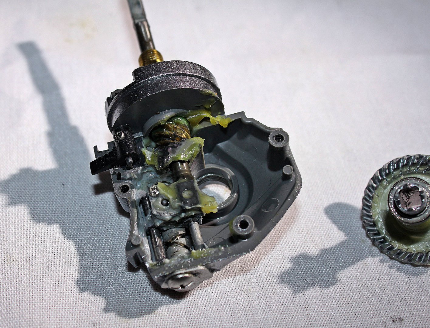Вскрыл, заметил что старая смазка (зеленая) побелела и и местами закоксовалась.
