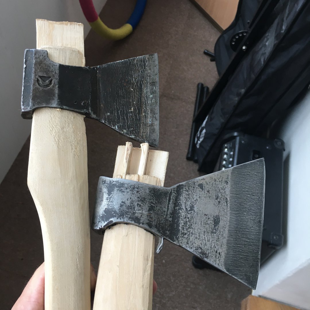 Не, были натурально клёпанные, обух согнут из пластины, и лезвие тоже из пластины. При попытке колоть дрова этот уступ в месте соединения упирался в торец полена, а плоское лезвие не расклинивало раскол как положено. И - ни туды, ни сюды...