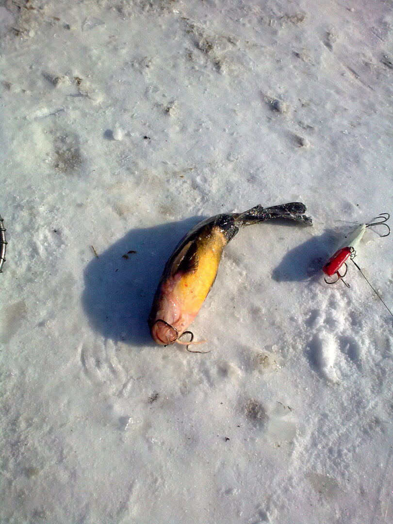Ловилось сегодня только в "прибрежных" лунках, глубина в которых подо льдом была не больше 0,5 м. "Глубинные" же, со слоем воды 1-1,5 м., весьма неплохо проявившие себя на предыдущих рыбалках, сегодня "молчали" напрочь: ни одного подхода за весь день! Часика в три я выяснил возможную причину "молчания ягнят": этот "страшный зверь" отгонял от них другую рыбу.