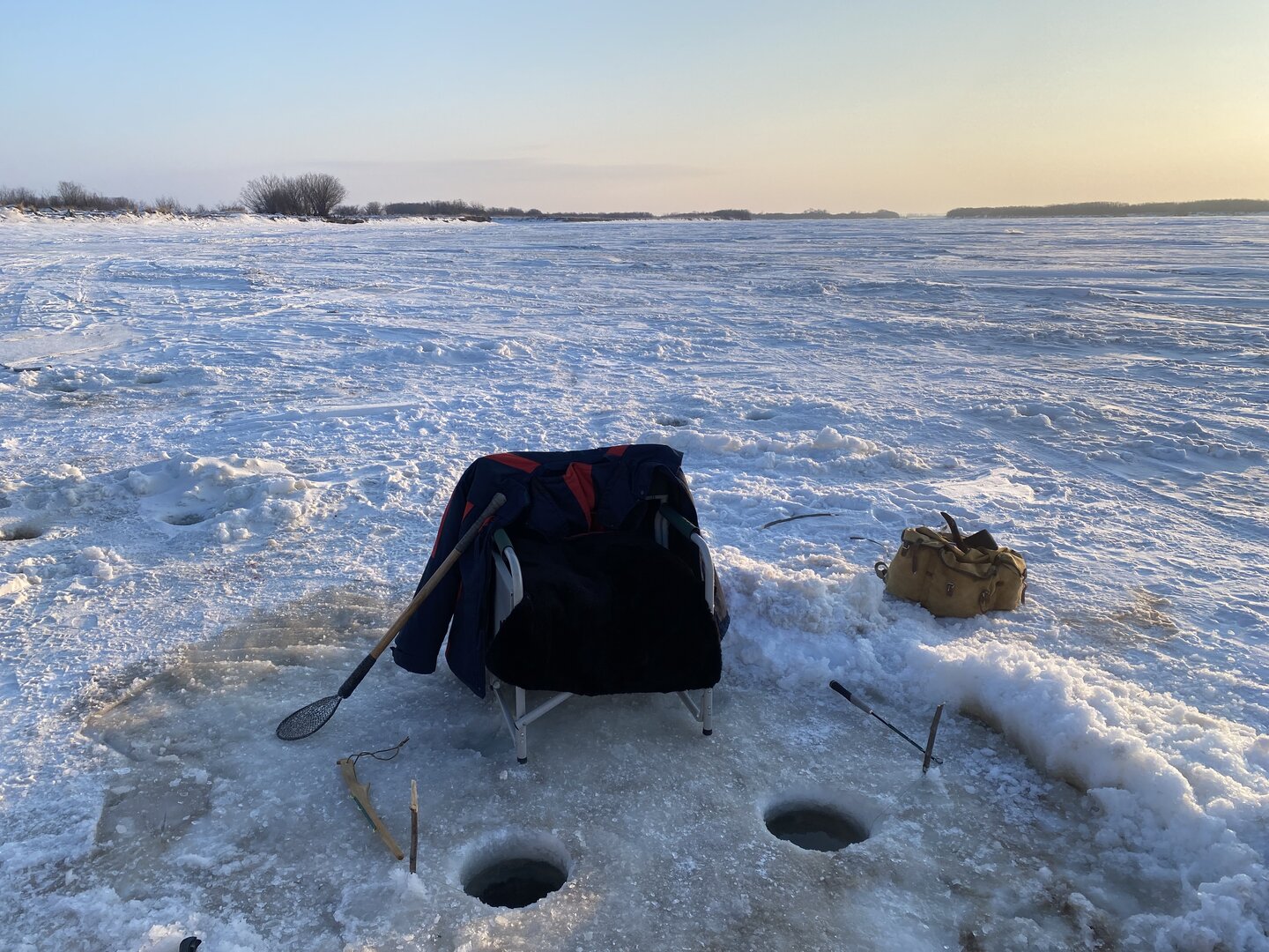 Дилемма: обновлять ли лунки недельной давности или бурить новые, решилась сразу. Всего за неделю они успели промёрзнуть на всю толщину массива, так что проблем с их "обновлением" (с нуля) не возникло, всё равно пришлось бурить весь слой, пешнёй только поменьше махать надо.