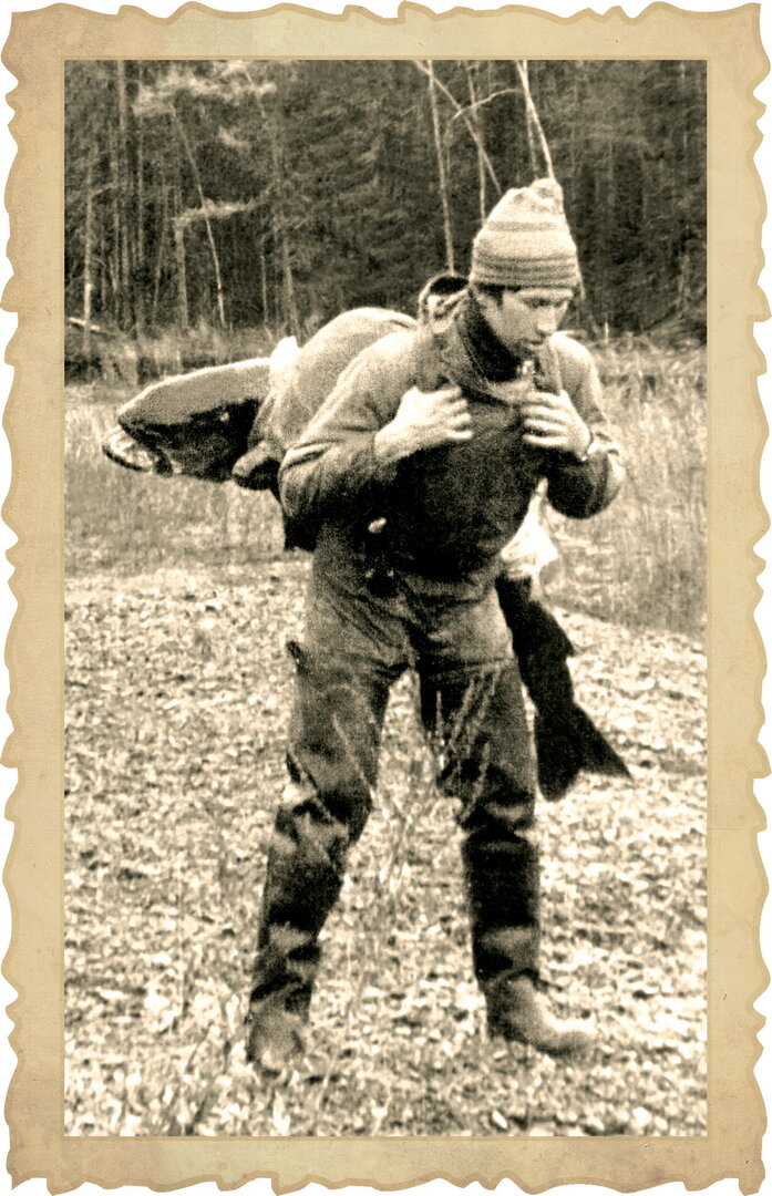 Это 1985 год. В экспедиции на реке Тугур. Я тогда уже начал заниматься цветным фото, что в те годы было диковинкой. К сожалению фото в полный рост не сохранилось. Мужик два метра ростом, штангист. Таймени тоже метра по два, я их поднять не смог. Все поймано на березовую палку с невской катухой.
