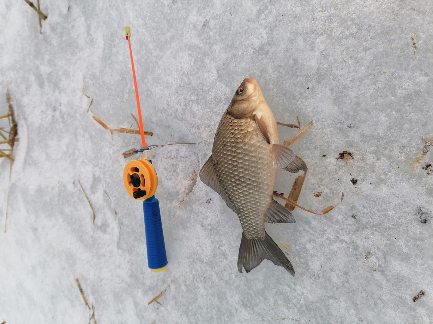 Видимо в этот раз караси ещё не впали в зимнюю спячку. Попадались на каплевидную мормышку. Опускал на дно, и после короткой паузы подъем вверх сантиметров на десять. Поклевки следовали в момент опускания на дно. Как пробурился, закинул в лунку вареной перловки, может это сработало еще, не знаю. Карася ловил зимой впервые, поэтому о каких-то других тонкостях рассказывать нечего. С ротаном все и так понятно. Там особо ничего не меняется. Общий итог рыбалки на фото.