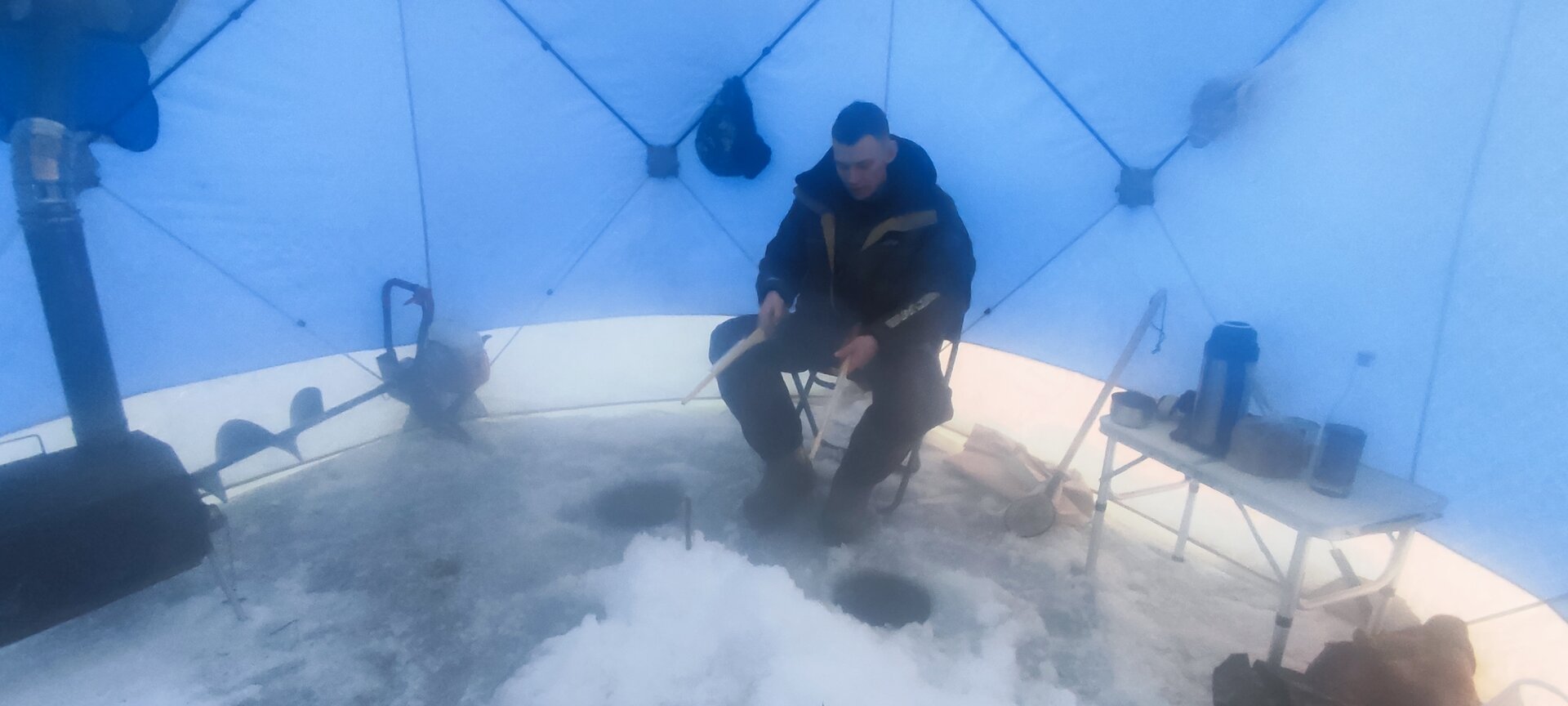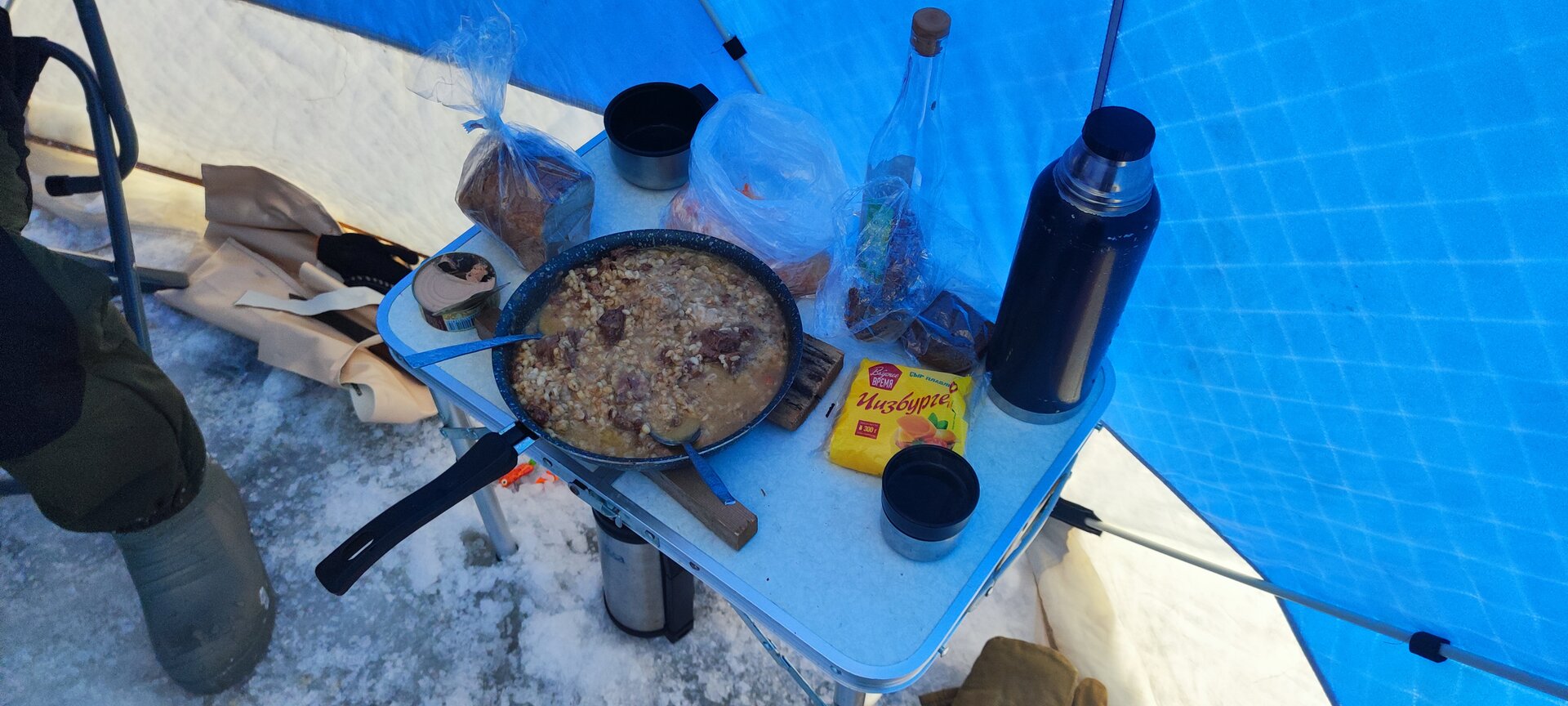 Поставили палатку, затопили печь, пробурились и сели махать... Время шло, тычки есть, результата нет... И так до обеда. У соседей почти так же...