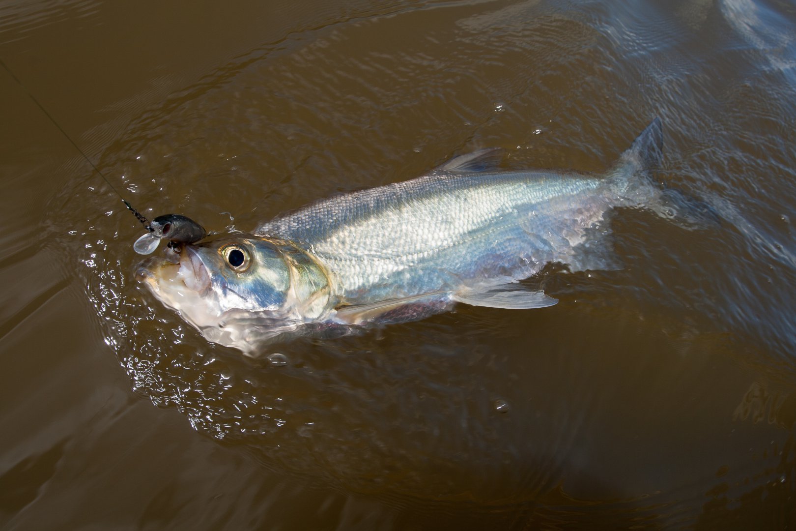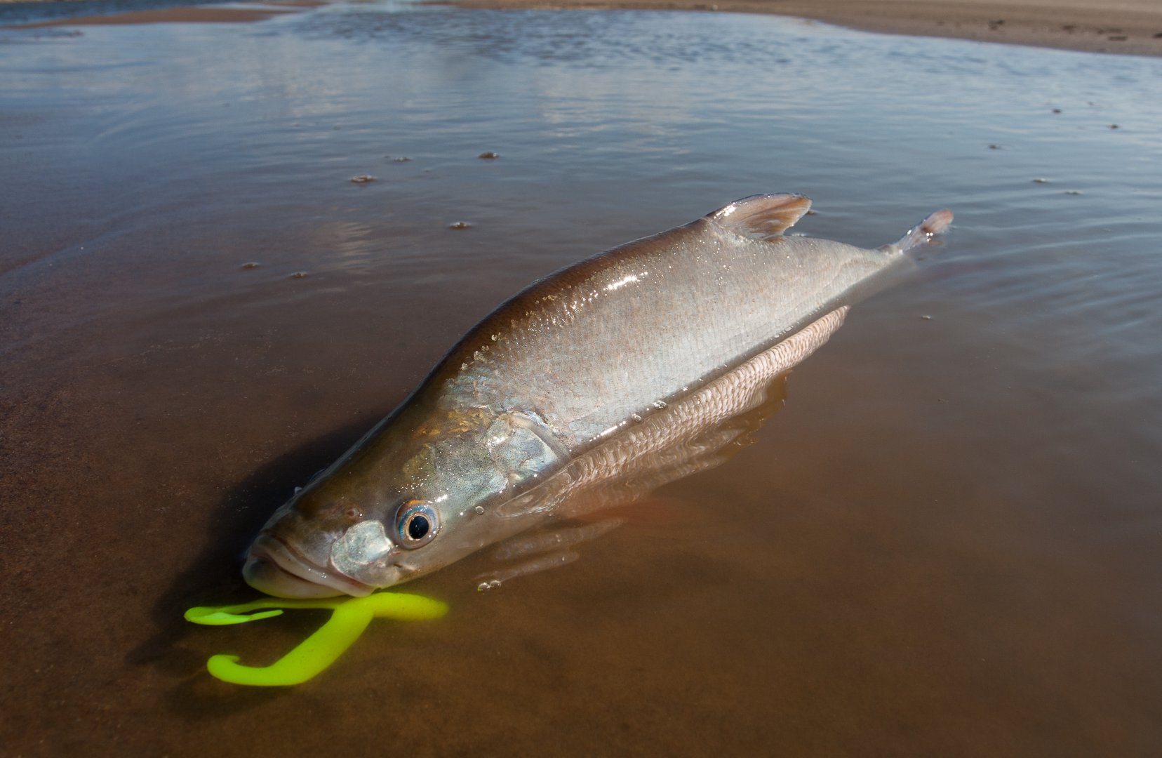 Верхогляд не очень крупный, чуть больше 4 кг. При вываживании верхогляд больших хлопот не доставил, посопротивлялся для приличия пару минут и сдался. Пробросали одно перспективное место и собрались переезжать на другое. Саша на скорости стал выматывать приманку, тут у него и долбанул желтощёк, метров 15 со шпули сразу смотал.