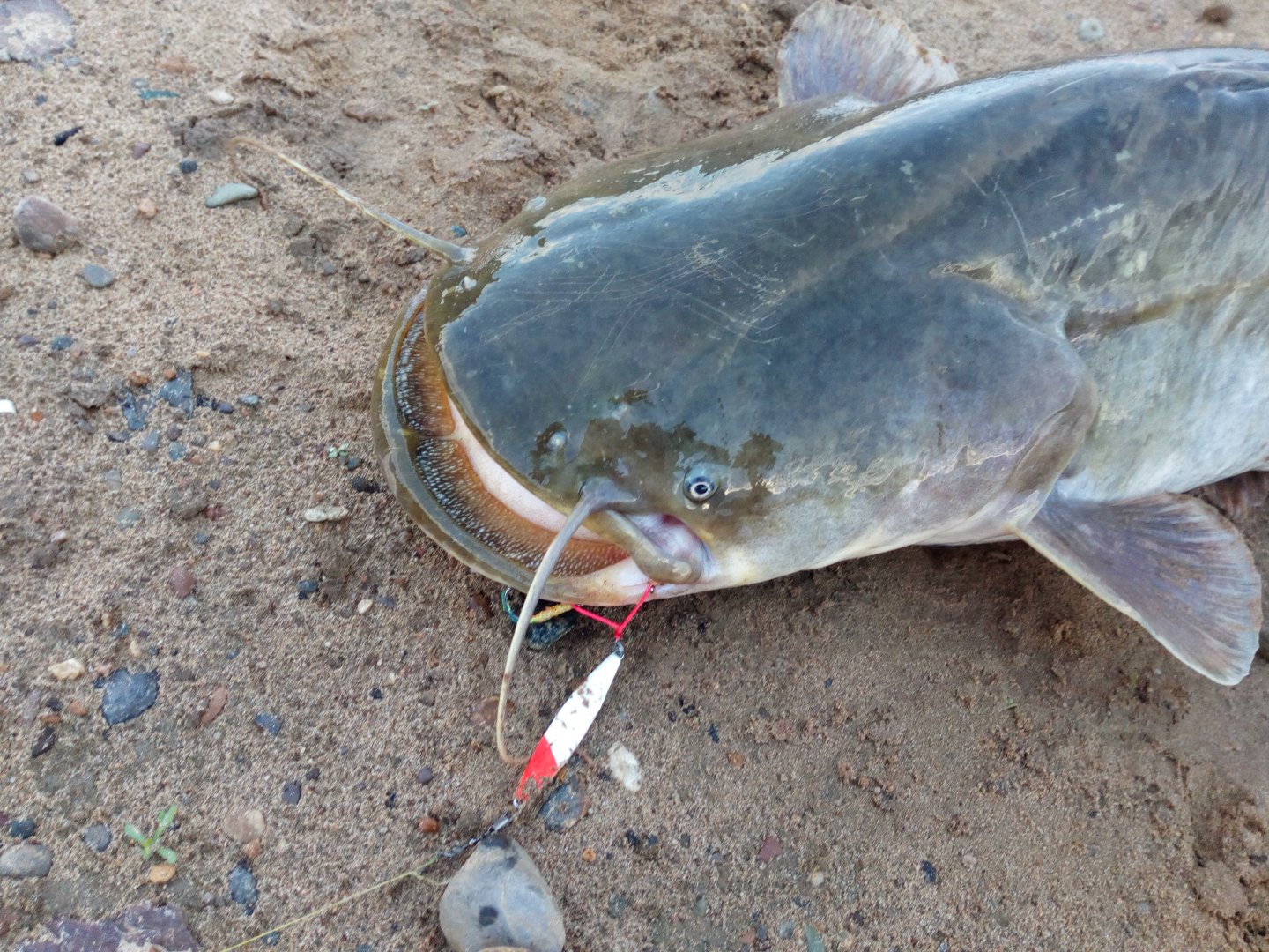 Ну теперь мы на равных. Течение в нейтралитете! Быстро сокращаю дистанцию до рыбы. Вот она уже под лодкой. Тоже притомился вражина. Пошли пузыри. Ну точно сом! Наконец, показывается усатая образина. Хлопает пастью. Крючок джигголовки засел под верхней челюстью. Как ещё не сломался?! Хватанув воздуха опять уходит вниз. Ну не-е-ет гад! Теперь я торопиться не буду - никуда не денешься. Я из-за тебя, упыря, якорь потерял. Опять вышел на поверхность. Хватаю левой. Благо рука в перчатке. (Постоянно борясь на джигинге с зацепами, перчаток не снимаю, иначе руки посечёшь). Не хватает рычага локтя, чтобы поднять рыбу! Втыкаю комель спиннинга куда-то в щель, и правой рукой тоже тащу за челюсть. Впёр!!! Мой победный рёв слышали, наверное, в Амурске.