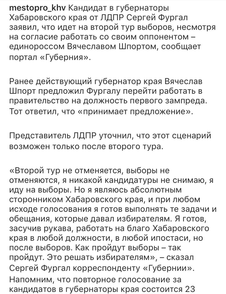 — Чтобы развеять все слухи, сплетни, интриги сообщаю — я не снимал свою кандидатуру! Гонка продолжается. В выборах я участвую. А то предложение, которое мне сделал действующий глава региона — имеет место быть. Но только в случае его победы. Искренне прошу не верить провокациям, — написал Сергей Фургал в социальных сетях (пунктуация и орфография сохранены).