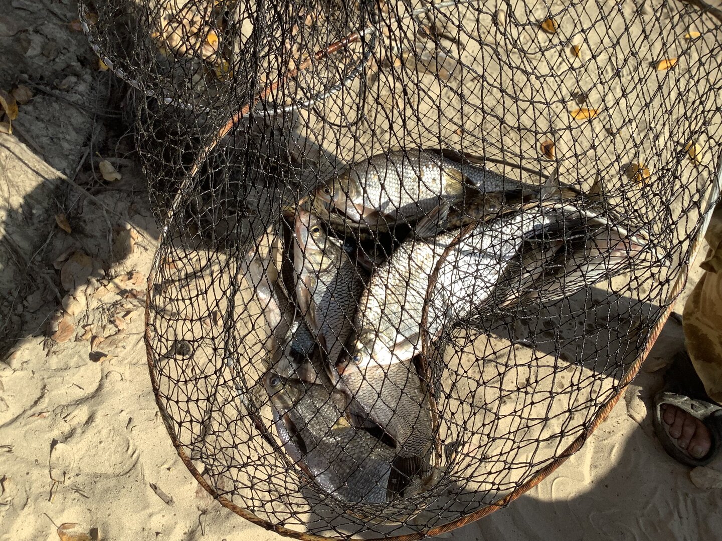 Первая партия лещей, мимо пролетел какой-то океанский катер и чуть не смыл волной садок. Еле успел его спасти.