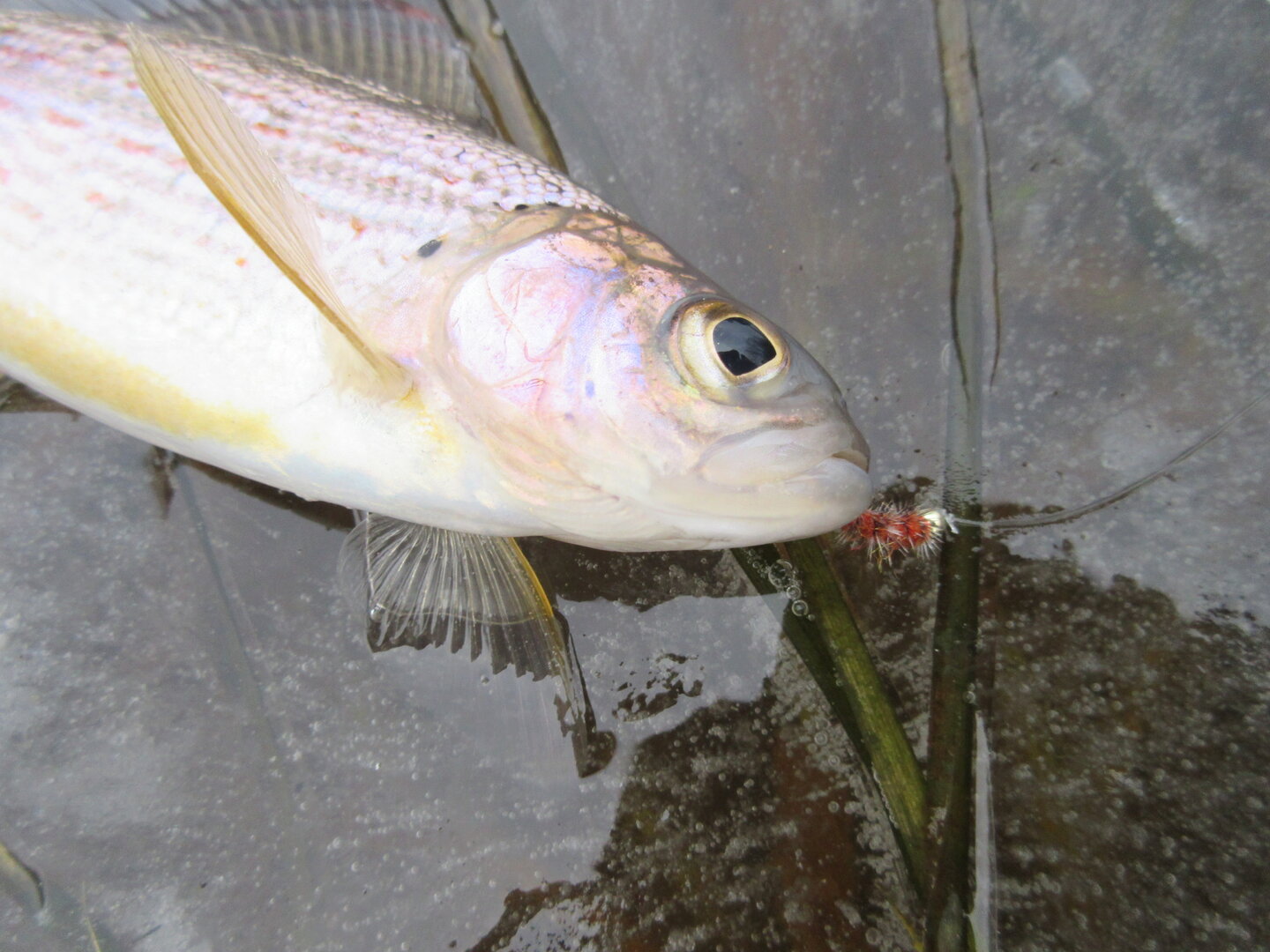 Судя по квадратным глазам, хариус охерел, когда увидел на что его поймали. Он то думал, что уже все, сезон закрылся. ))))